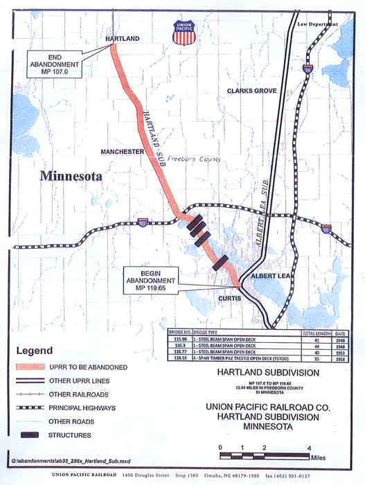 The Union Pacific trackage used to belong to the CNW, and the IC&E was formerly the Milwaukee (and then SOO). I need to do further research into the lineage for the DM&E/UP's track heading NW out of town, after it was the M&StL. If anyone knows and wants to share, please email me.