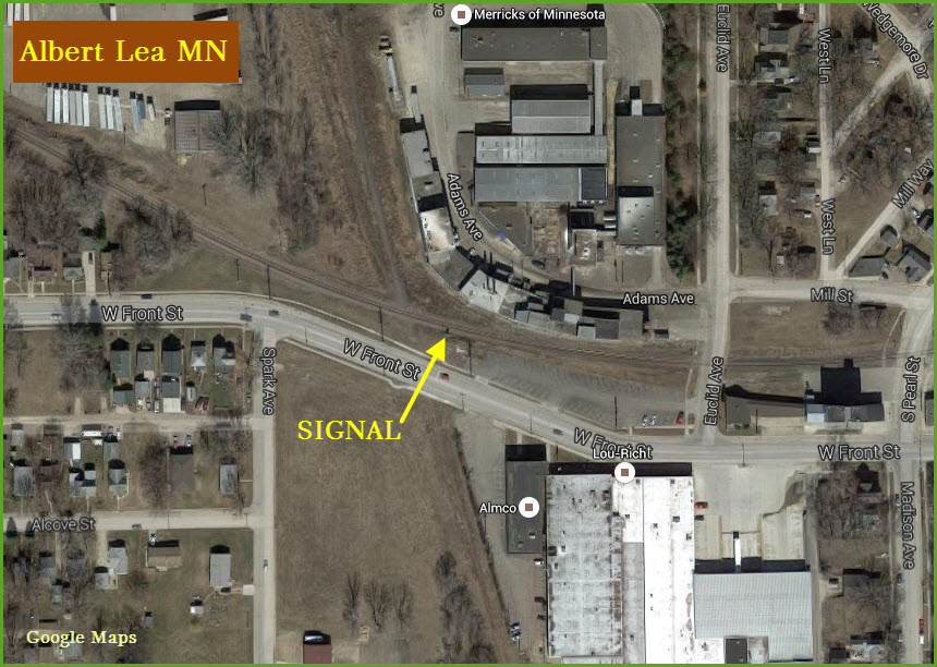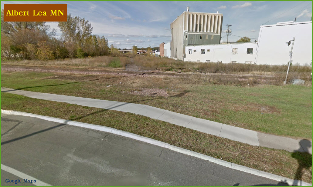 Update Feb 2014 - The M&StL / UP N-S line was vacated several years ago (in 2011) and all trackage has been removed. It was vacated as far as the grain elevator (pictured at the bottom of the page) which is now served from the North only through Waseca. This eliminated the western diamond on Front St and the junction on the south side as well. Jim Mihalek provided a link to an article on the change: http://www.albertleatribune.com/2011/11/a-future-trail/