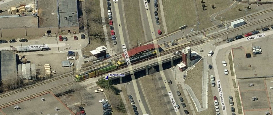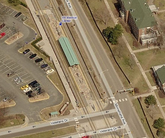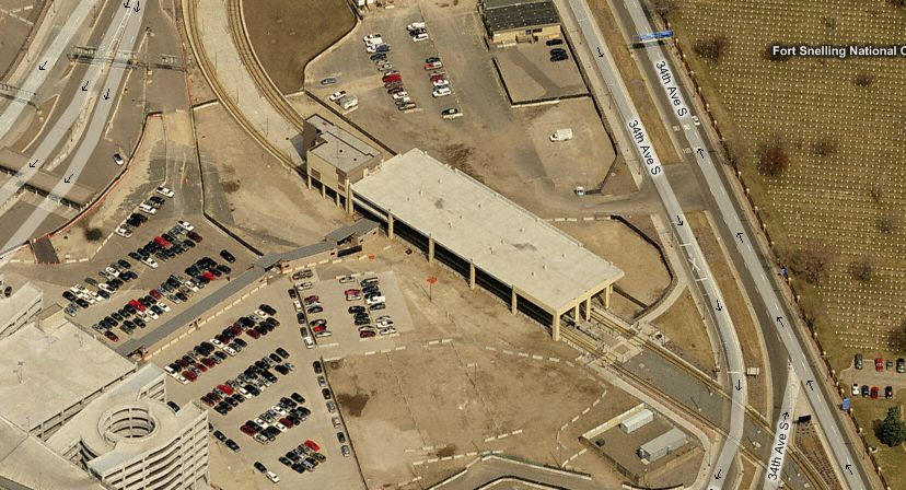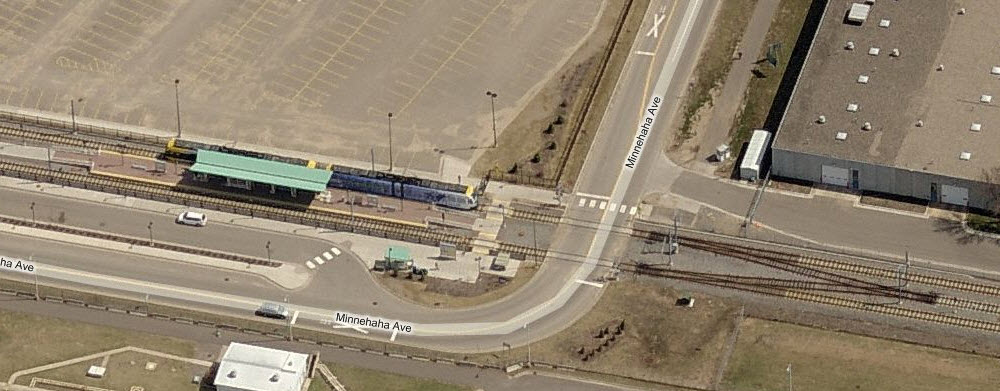 The Target Field Station opened in 2009 to allow commuters easy access to the Northstar Commuter Rail Line. As of this date (the end of 2011), Google wins in the aerial photo category, as Bing has not updated their fly-by pictures yet. The light rail station is right at the commuter rail station, and goes into a short single track section before going into a double track stub... my guess is that it was easier and cheaper to do this than build a double crossover.