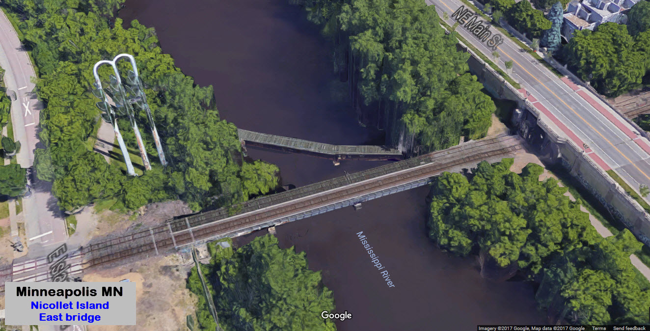 There are two bridges going to Nicollet Island, for it sits in the middle of the Mississippi River. On the north side of the tracks is a small housing community, on the south side is DeLaSalle