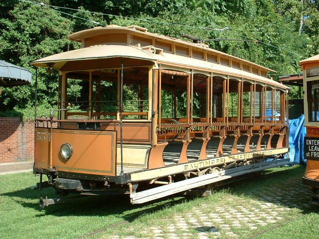 Car 554 is a 9 bench open car built by the Brownell Car Company in 1896 for the Baltimore Traction Company.