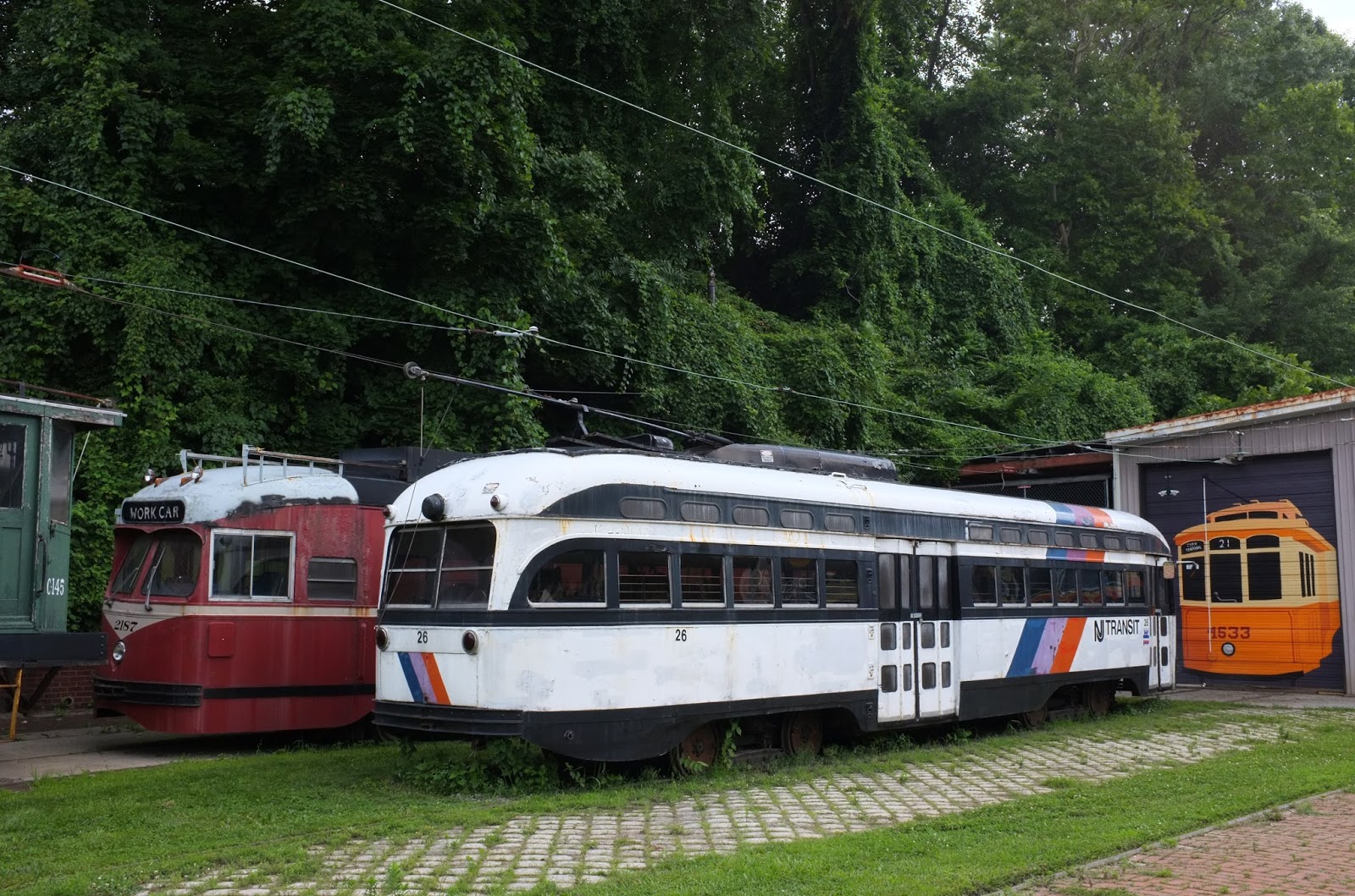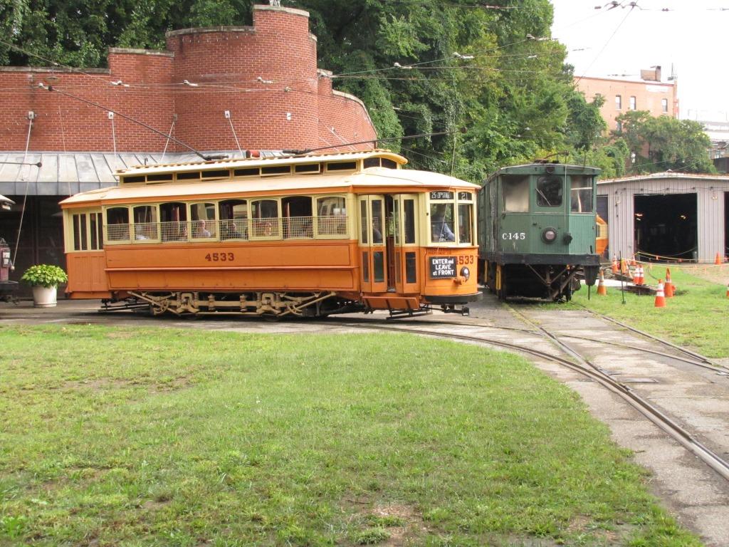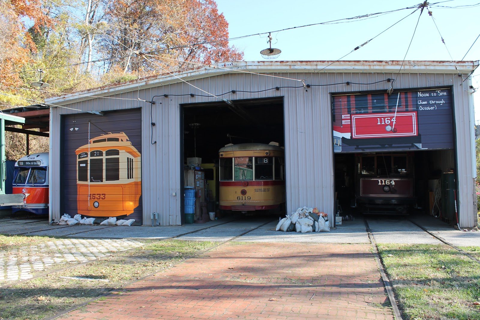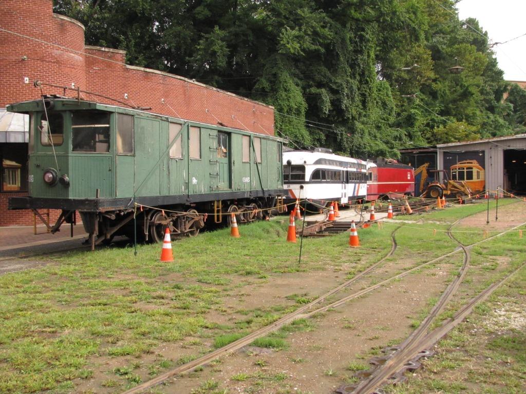 The north end of the carbarn, with the visitors center on the left. The NJT (New Jersey Transit) car and sweeper stand watch over everything.