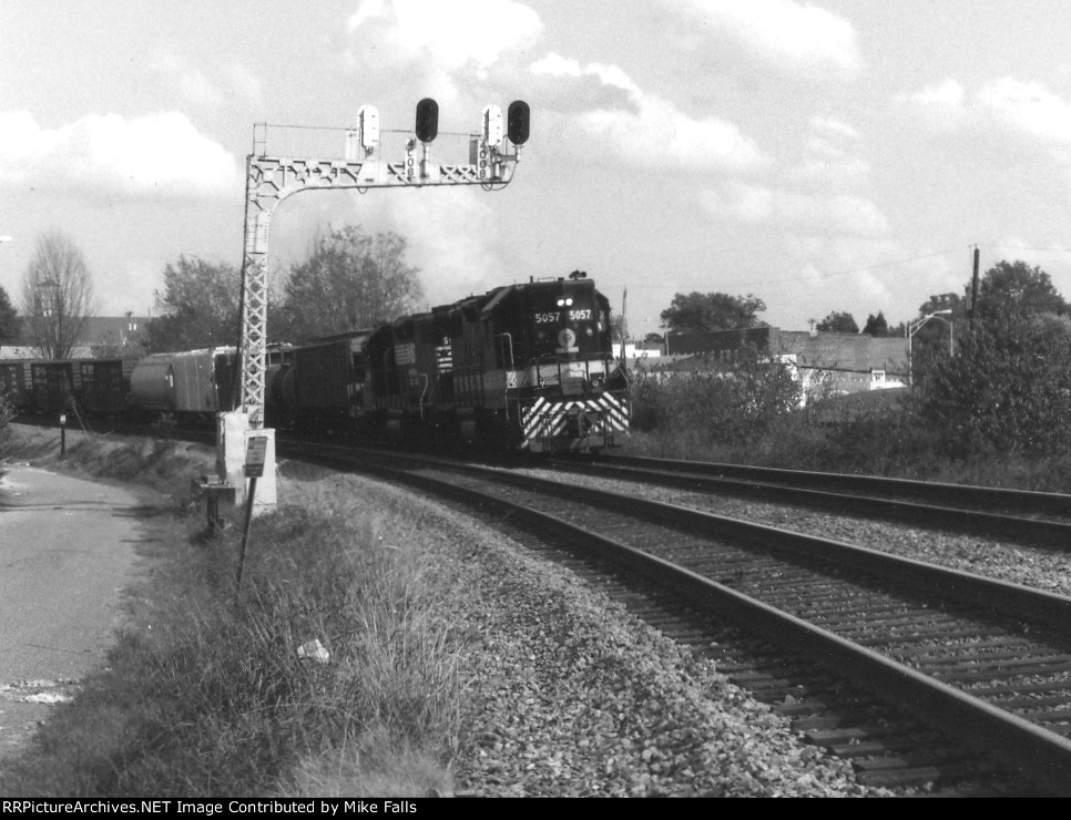 NS 5057 still in Southern Railway colors leads train past cantilever signal in Gastonia / 1988.