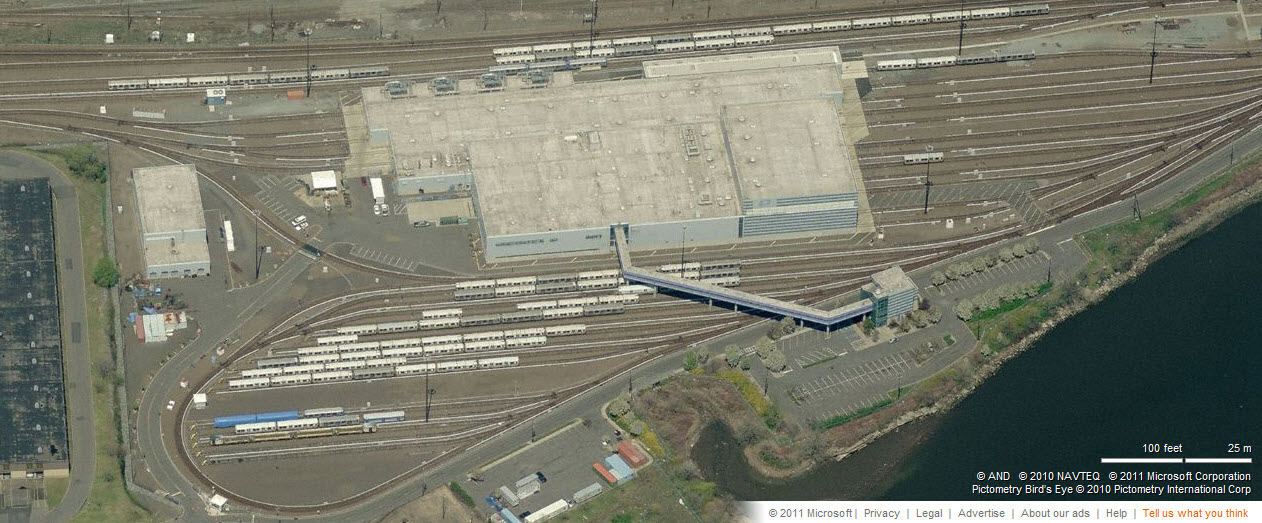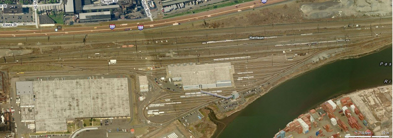 Just on the other side of the Passaic River and the PATH shops is the Harrison Station. The full size photo is a conglomeration of tracks just south of the station... only in the northeast do you generally see stuff like this. The small picture to the right is an aerial shot of an NJT train coming into the Harrison station.