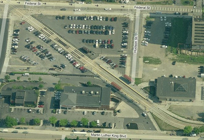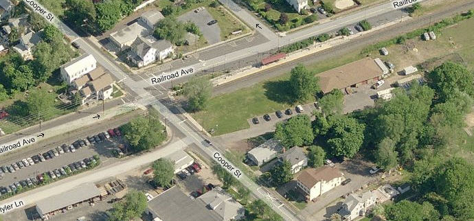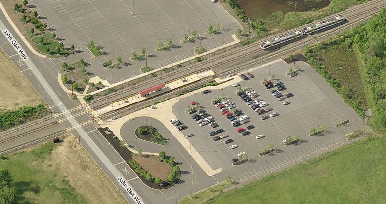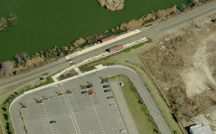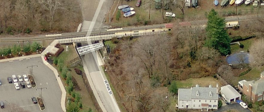 In the aerial view below, the white arrow points to the station, the yellow arrow points of a SB signal, the blue arrow points to part of the old wye right-of-way, the orange arrow points points to a historical marker, and the green arrow points to an old trestle (which is almost impossible to see during the summer).