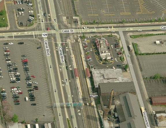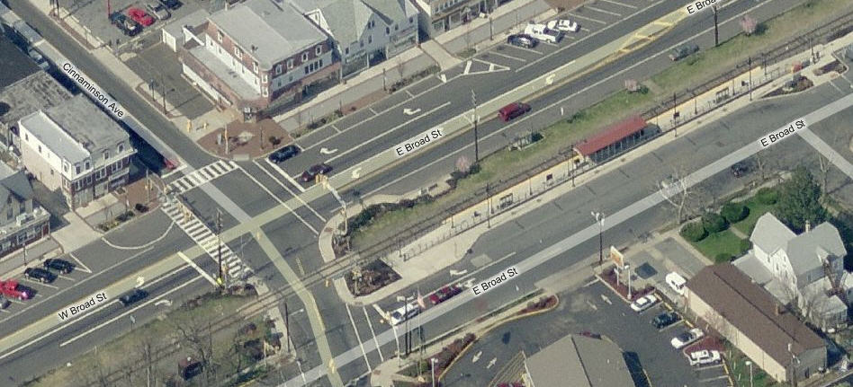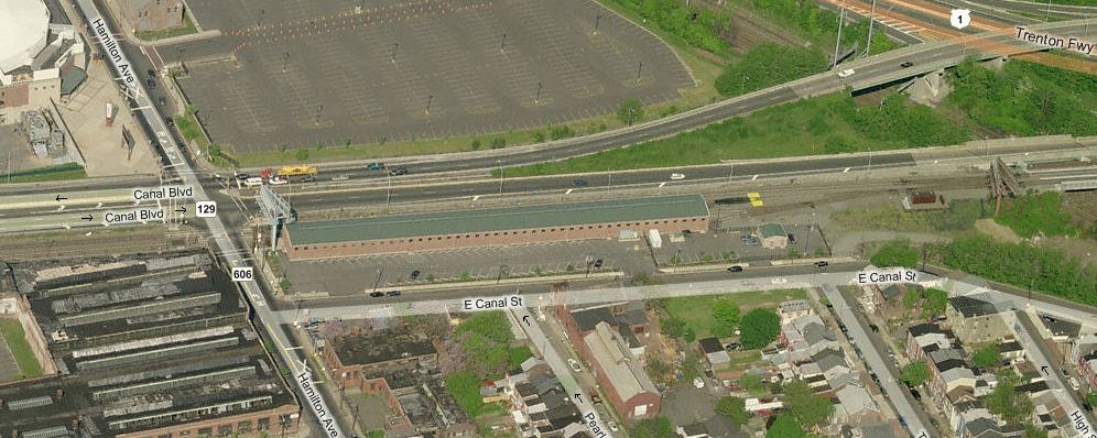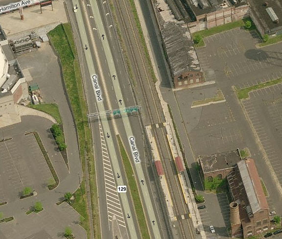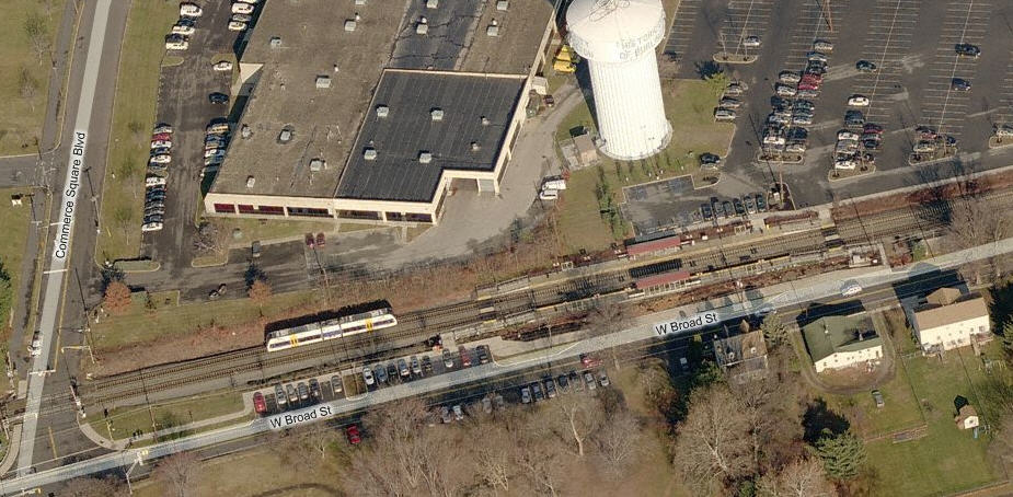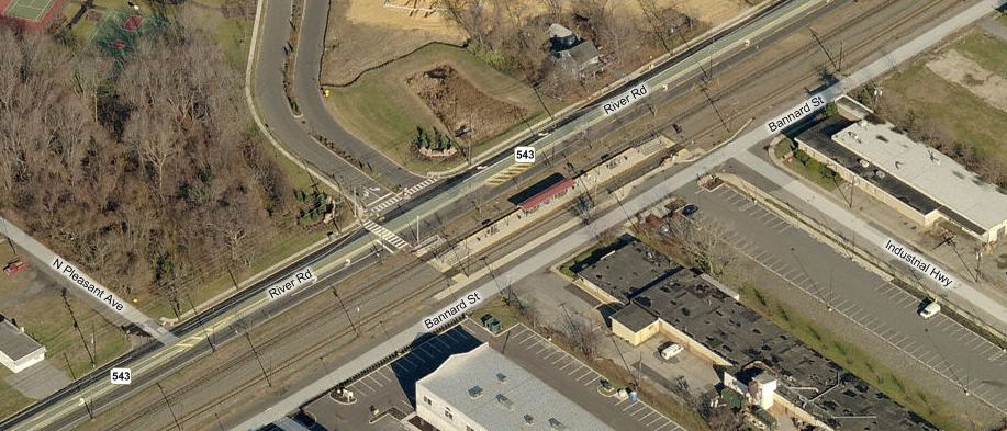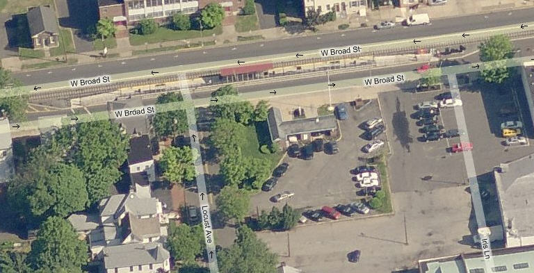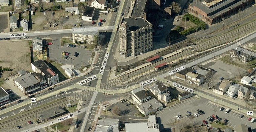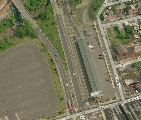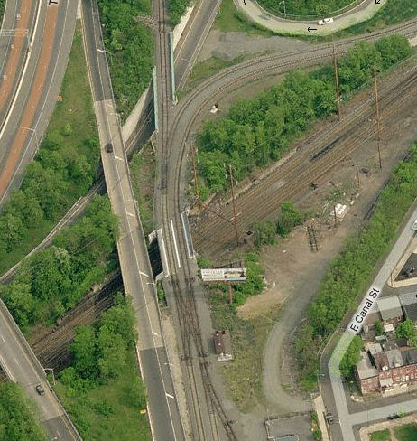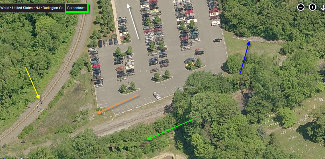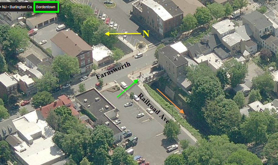 In the picture below, we are in the downtown area of Bordentown where the Camden & Amboy RR memorial is (green arrow). The orange arrow points to the wye at the Bordentown station. The view is shifted 90 degrees, with north to the left. More info on the C&A is here.
