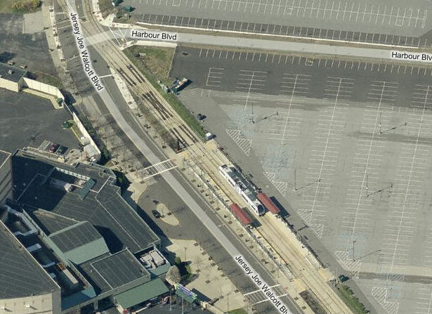 New Jersey Transit's River Line travels between downtown Camden and downtown Trenton NJ. It travels past Conrail's Pavonia yard in Camden, where the shops are on the north side of the yard. It takes a little getting used to, as the LRV's are diesel powered instead of being electric.... so there is no overhead wire.