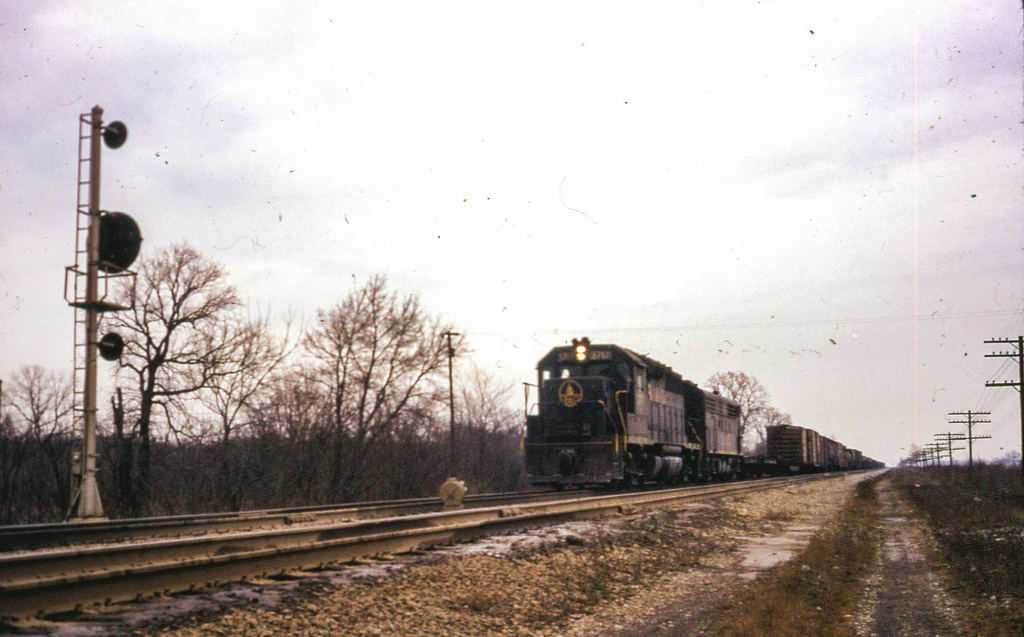 Engines DT&I 225 and GT 5918 are making a setout at Hamler, Ohio on August 14, 1982. The semaphore signal is on the former B&O mainline from Pittsburgh to Chicago. Unknown photographer. Found here