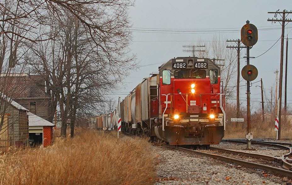 Picture by Aaron J Border, 31DEC2010. On New Year's Eve 2010, IORY SD40-2 4082 bring grain loads south across the CSX diamonds at Hamler for interchange here.