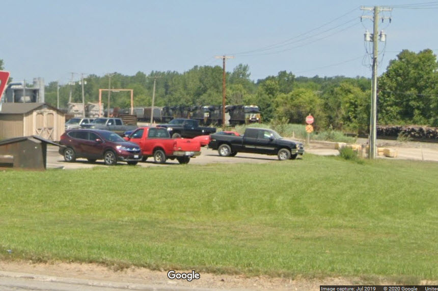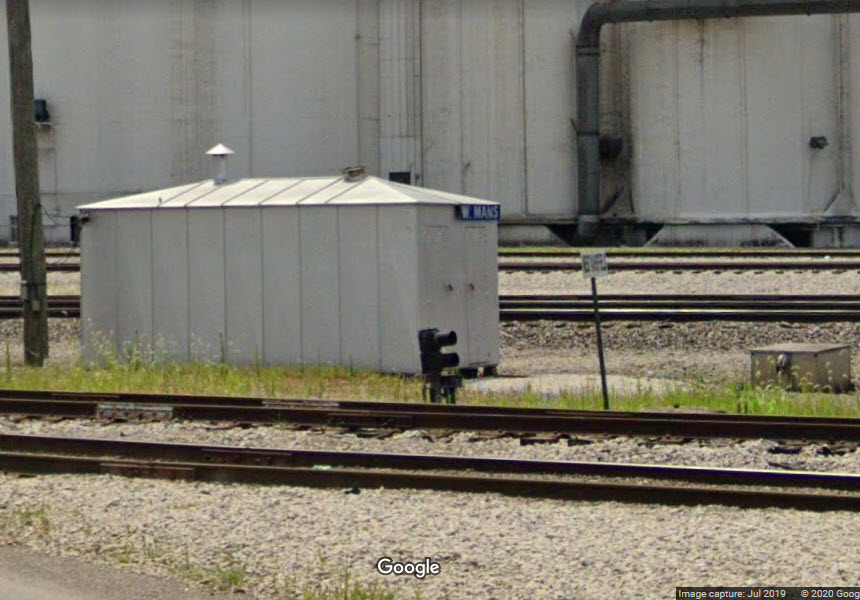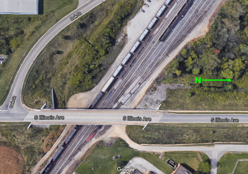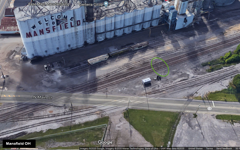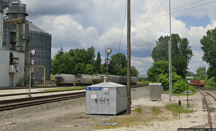 a grain elevator next to Main St/OH-13. The line continues north and crosses