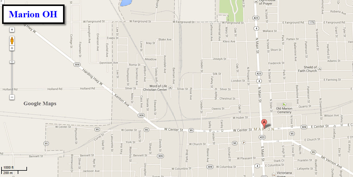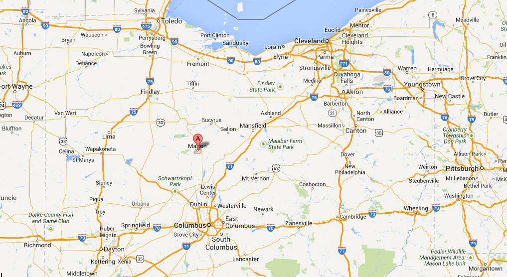 Marion is about 40 miles north of downtown Columbus OH, and between I-75 and I-71.