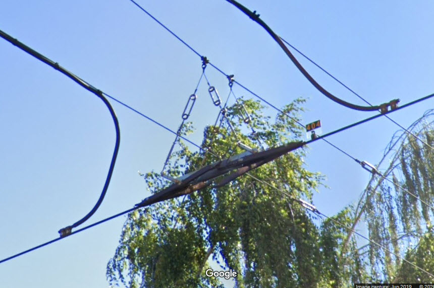 city areas, a single contact wire is used to minimize the amount of overhead wiring. All other