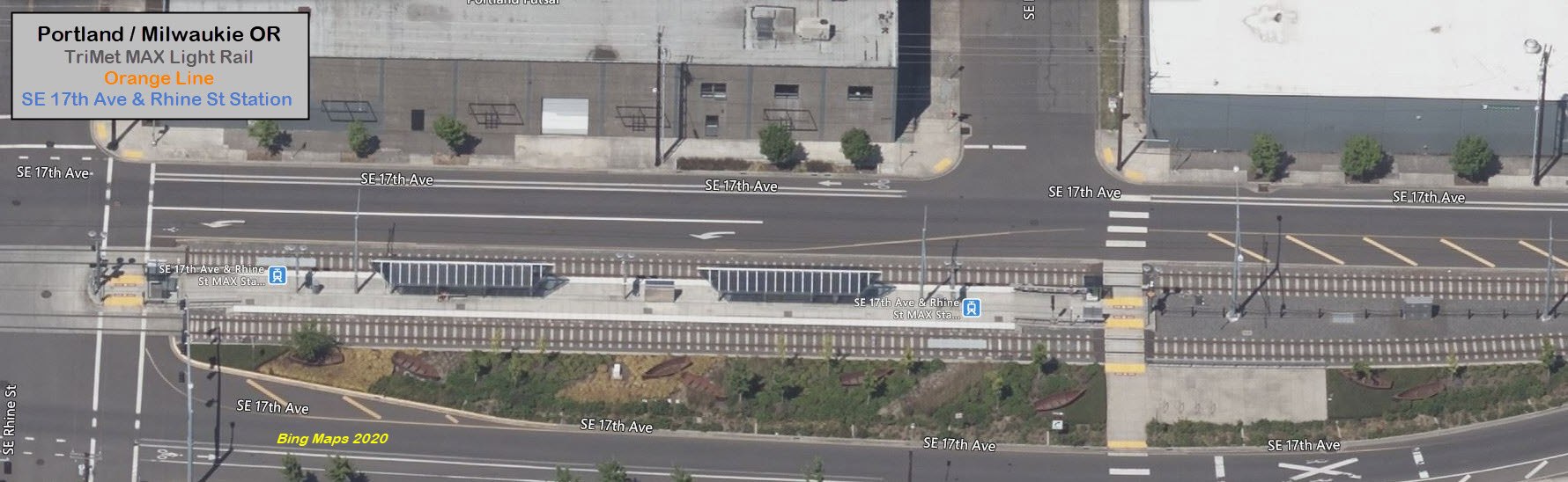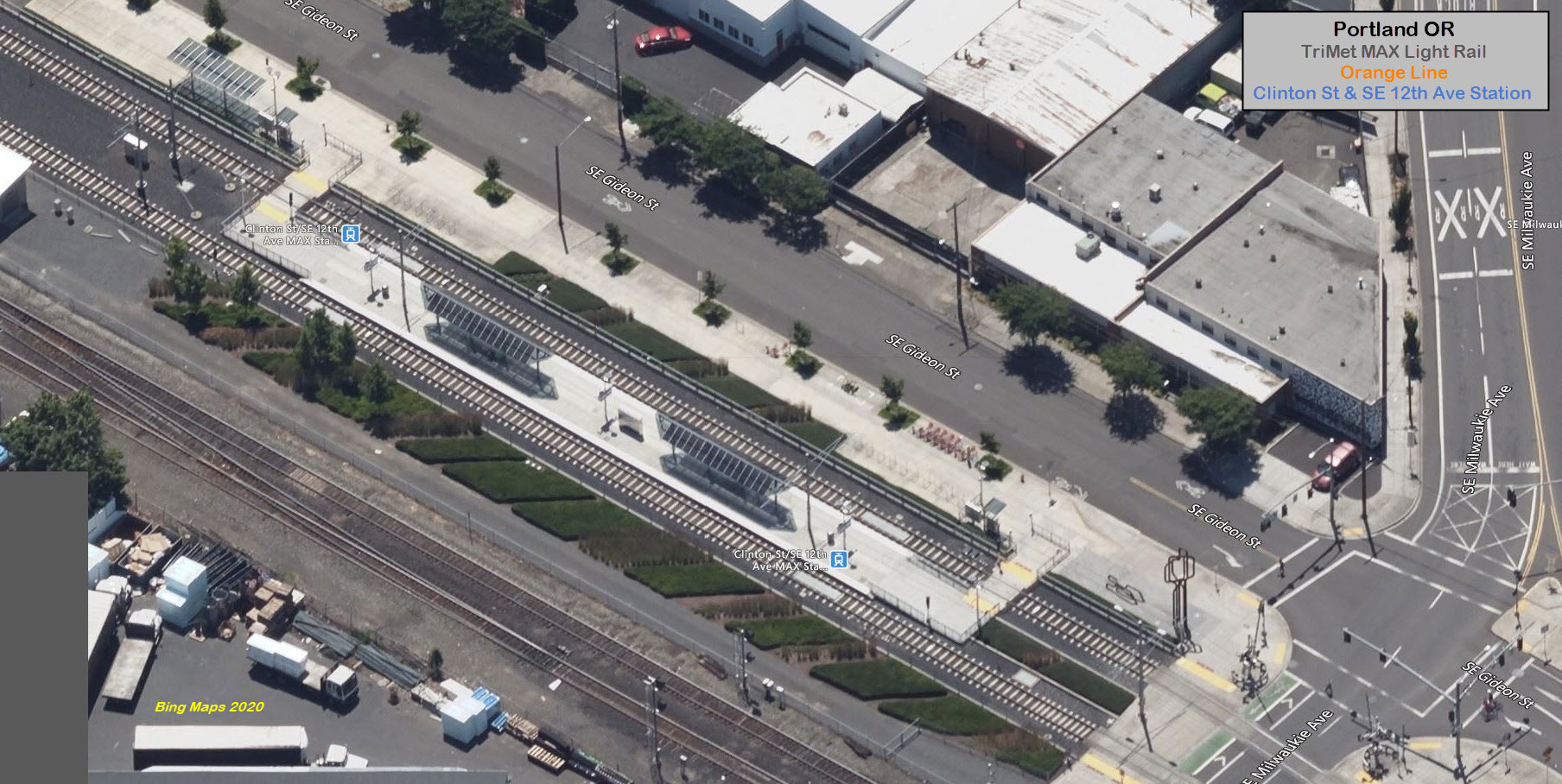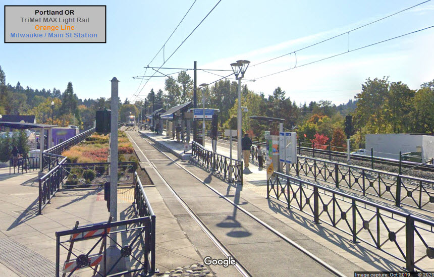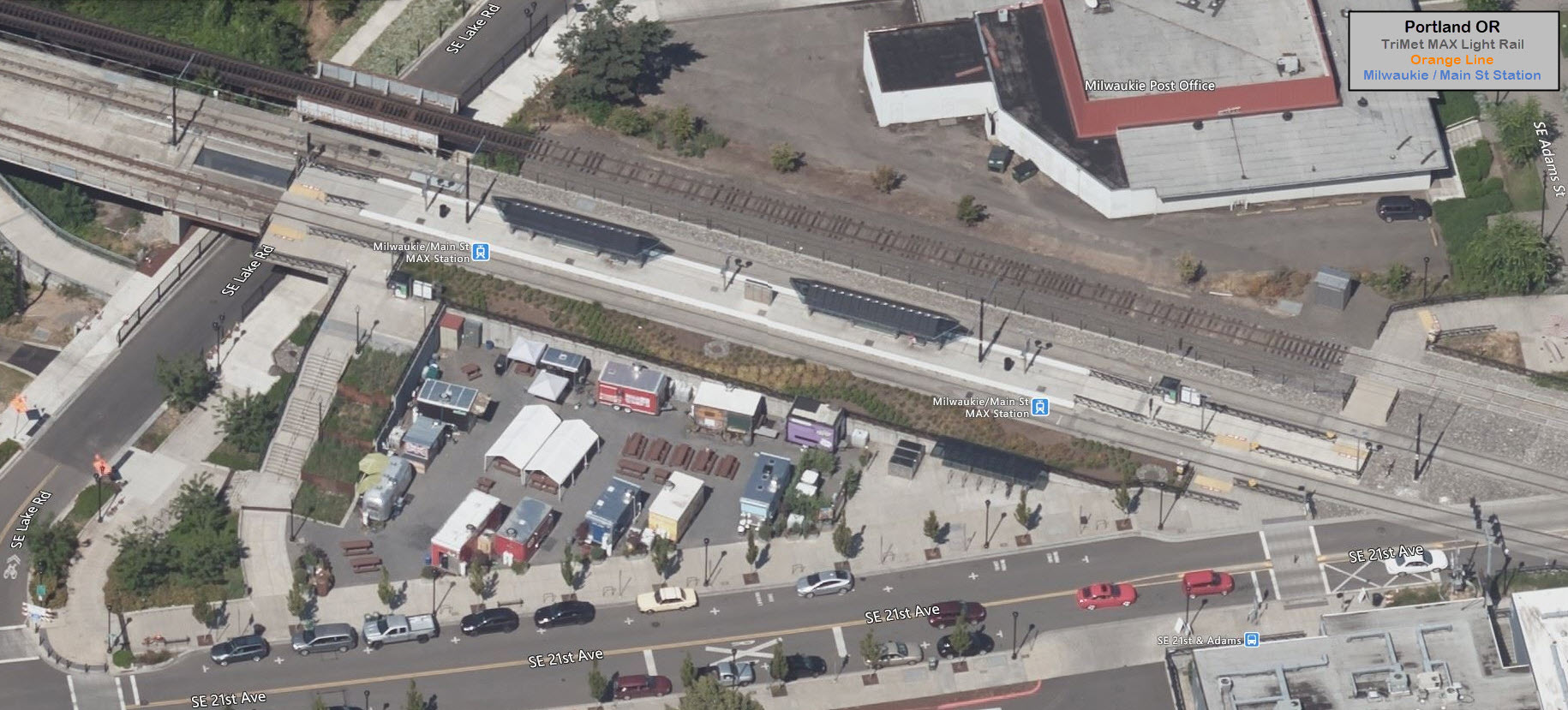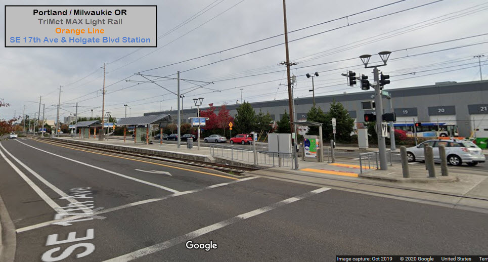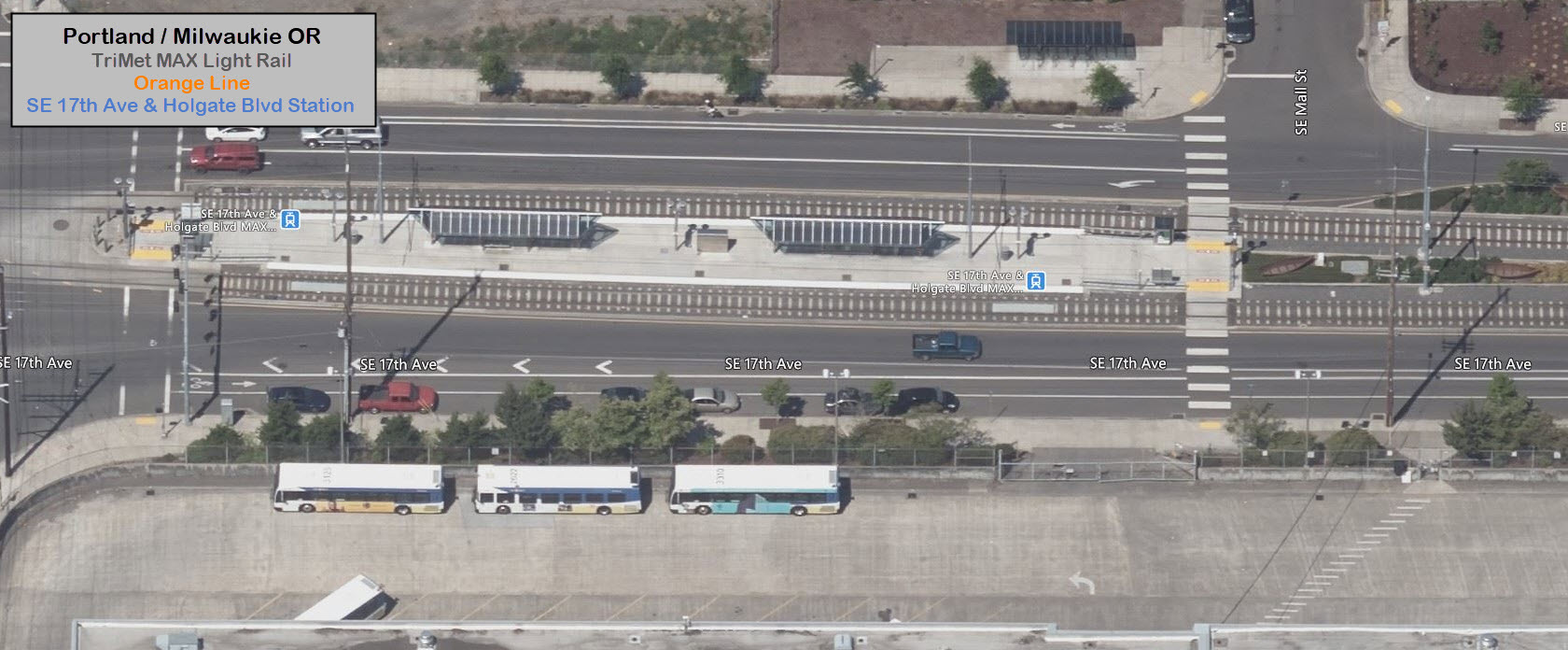 roads and Kellogg Creek. The end of the Milwaukie station platform can