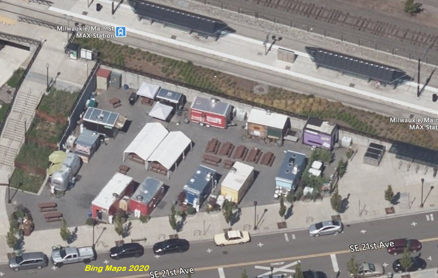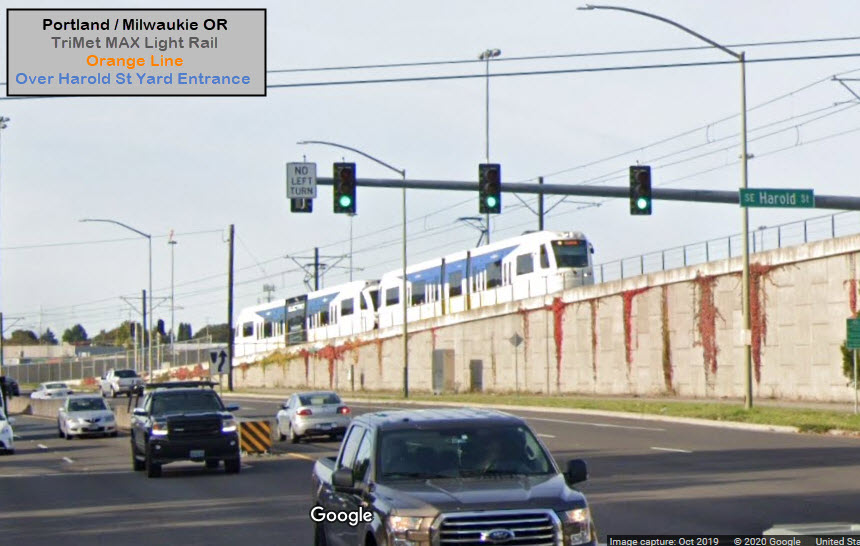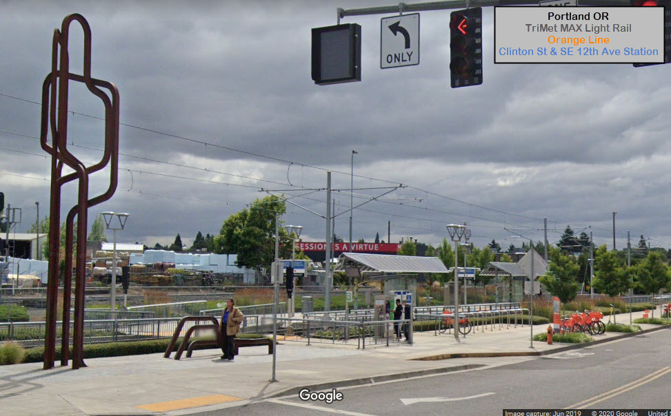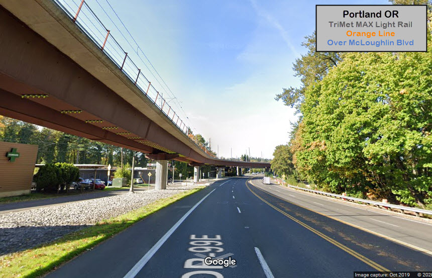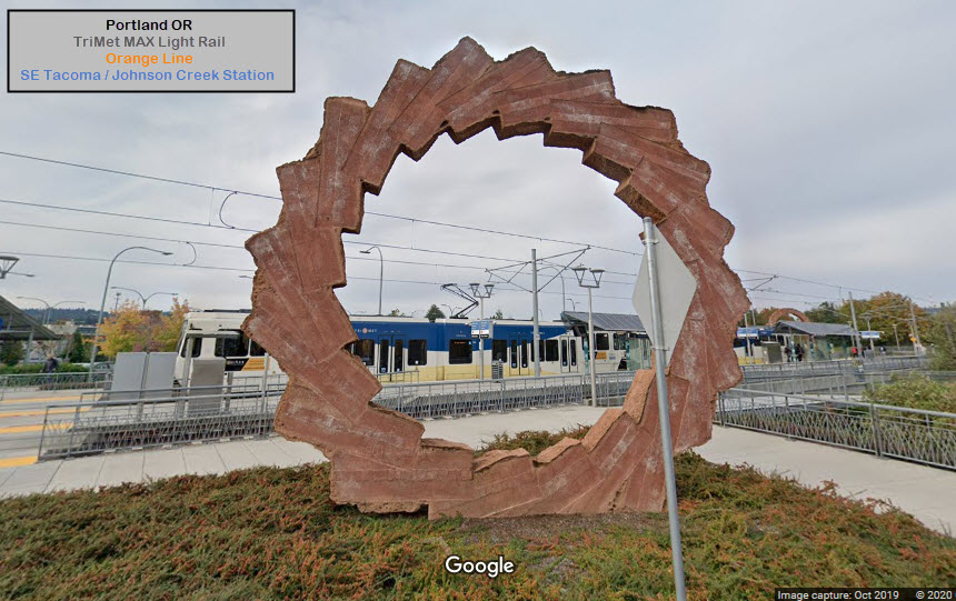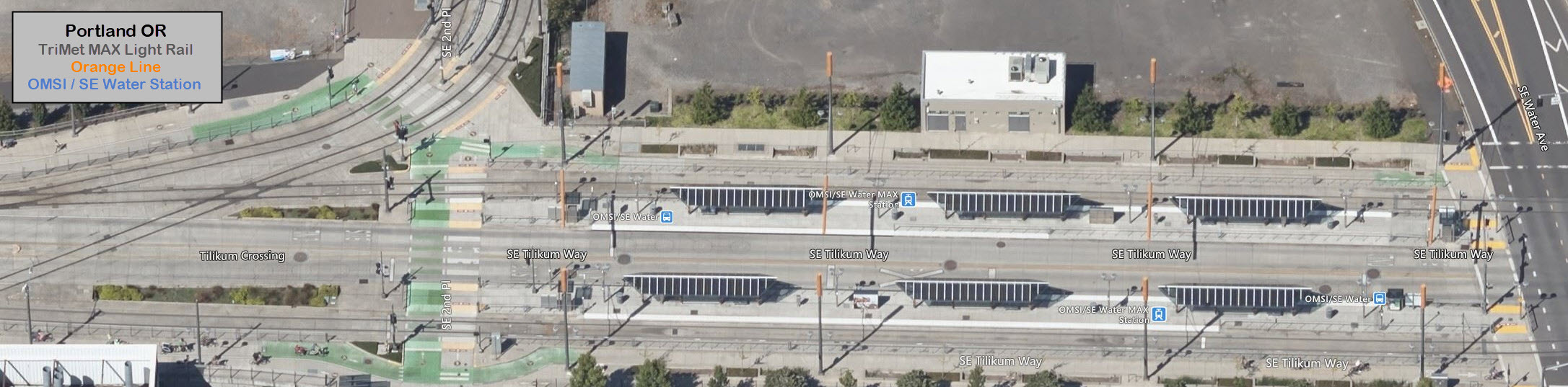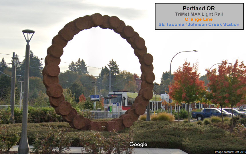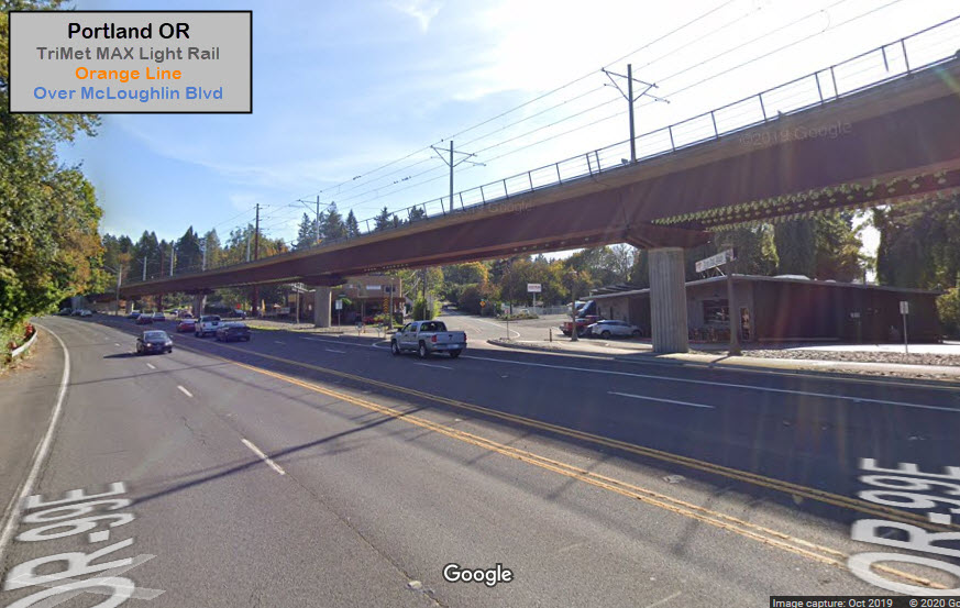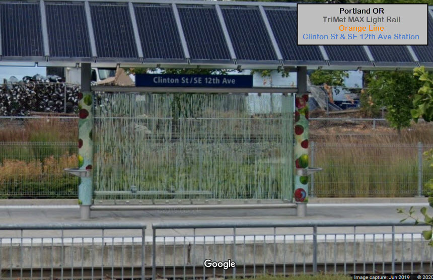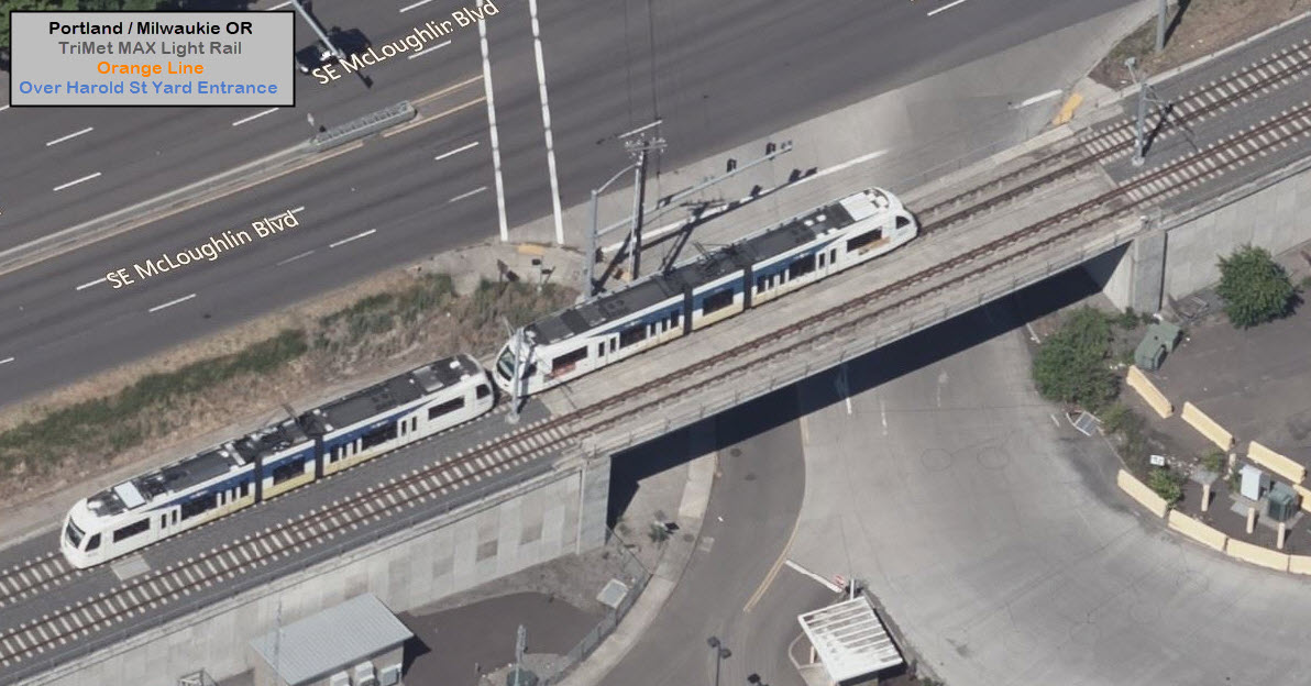 roads and Kellogg Creek. The end of the Milwaukie station platform can