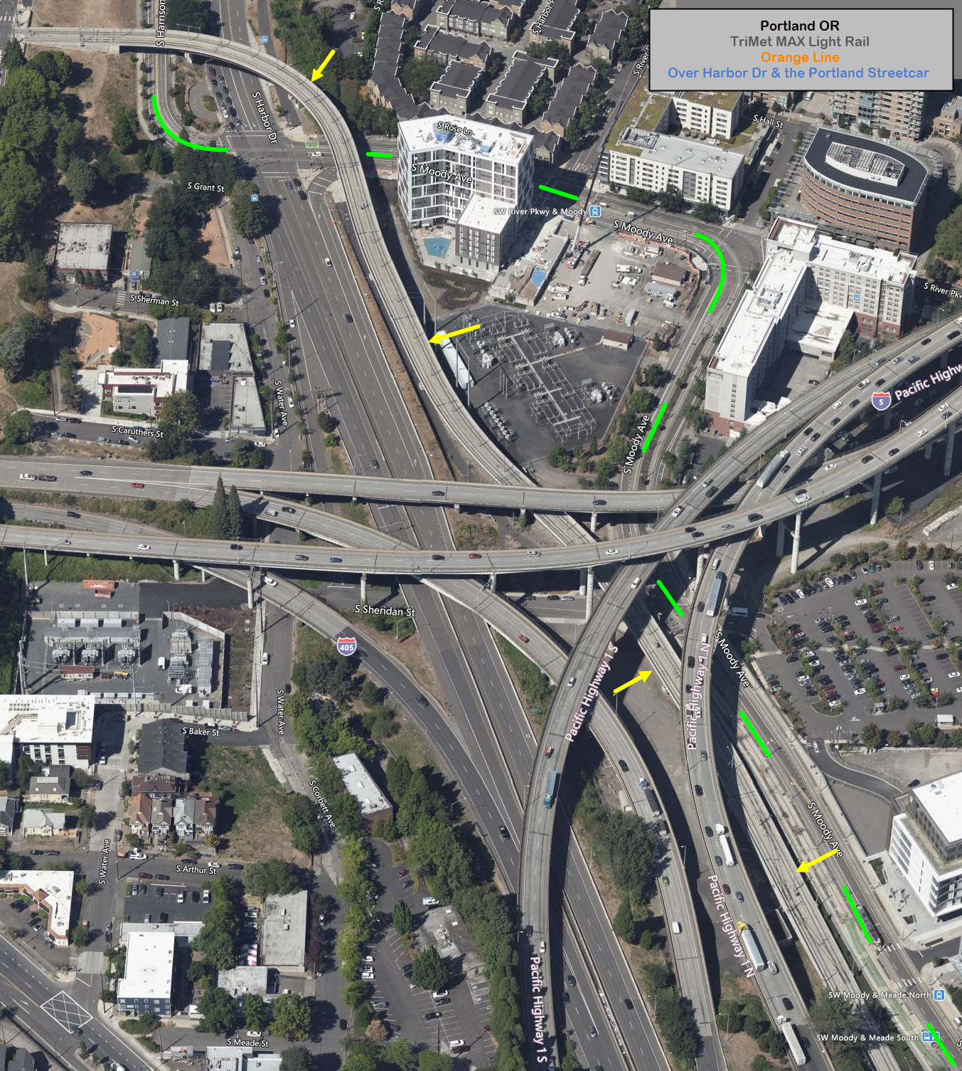 Here, the two lines of the Orange Line cross the two tracks of the Portland