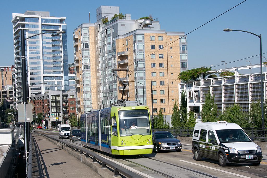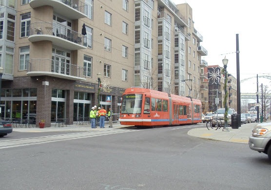 Portland Streetcar "Central Loop" first run. Car 009 climbing the Lovejoy Street ramp to the Broadway Bridge.