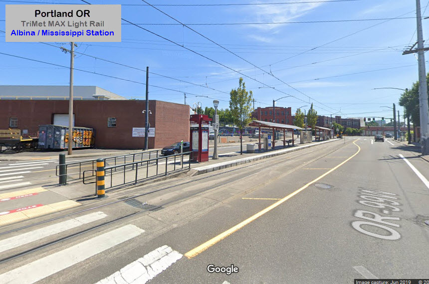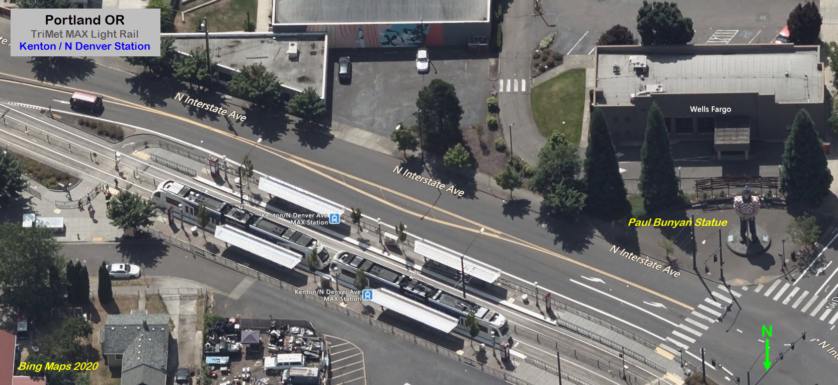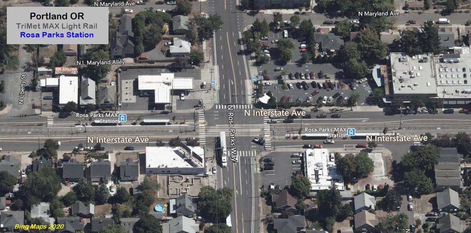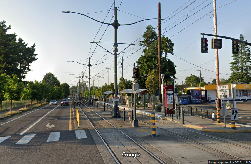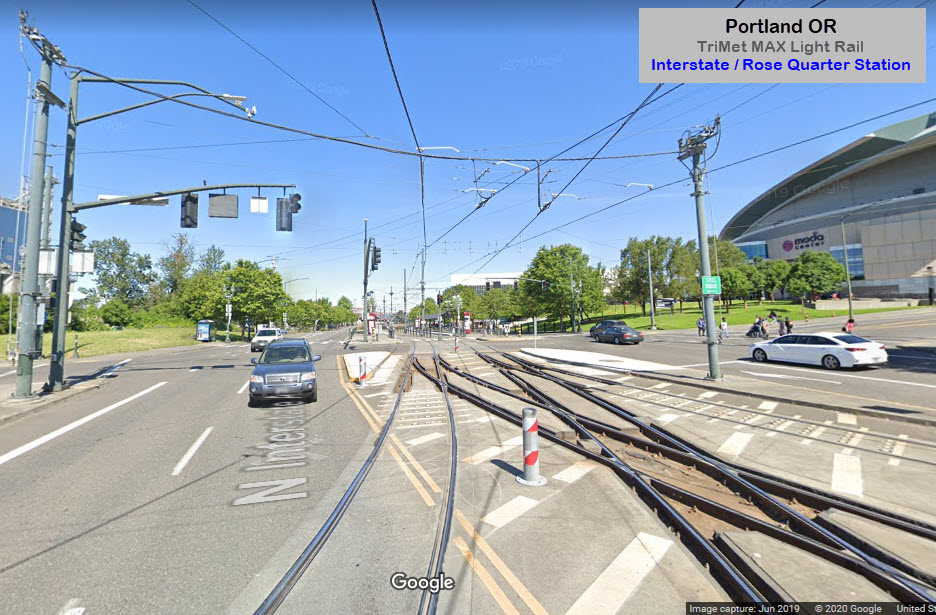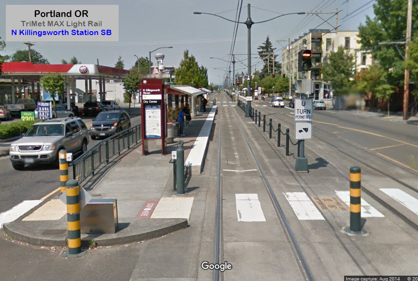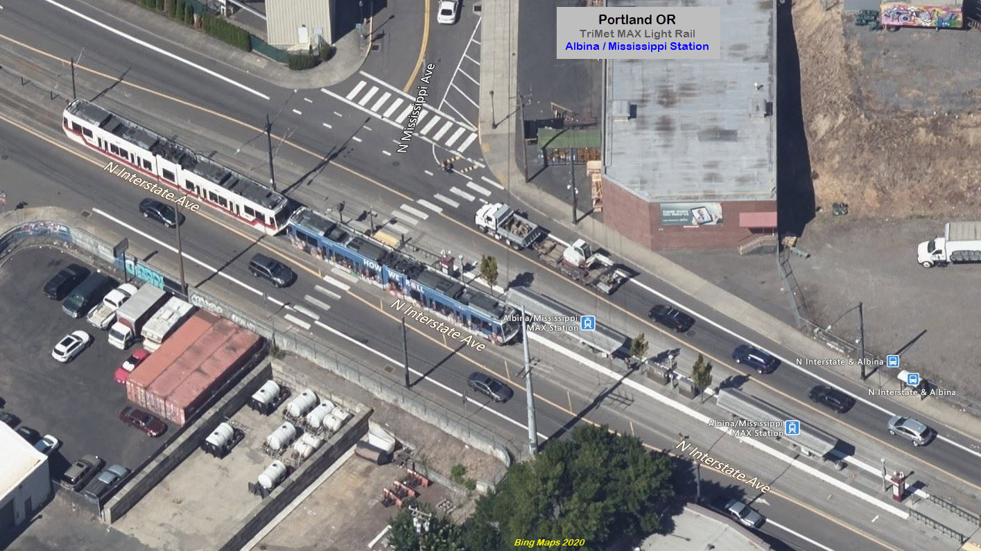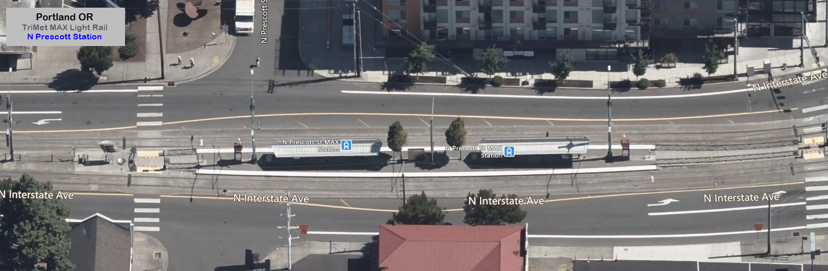 Just to the south of the station, the tracks leave the middle of Interstate Ave,