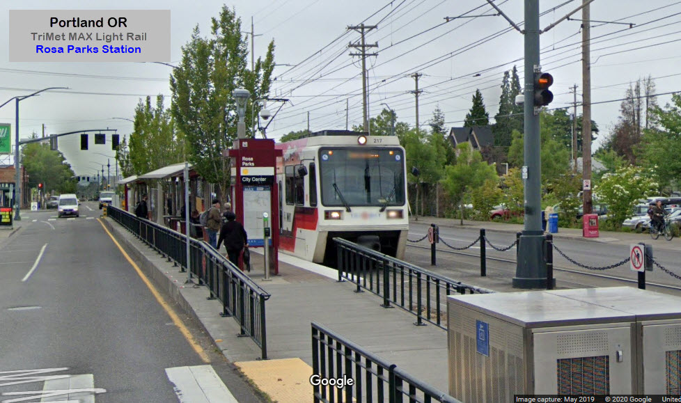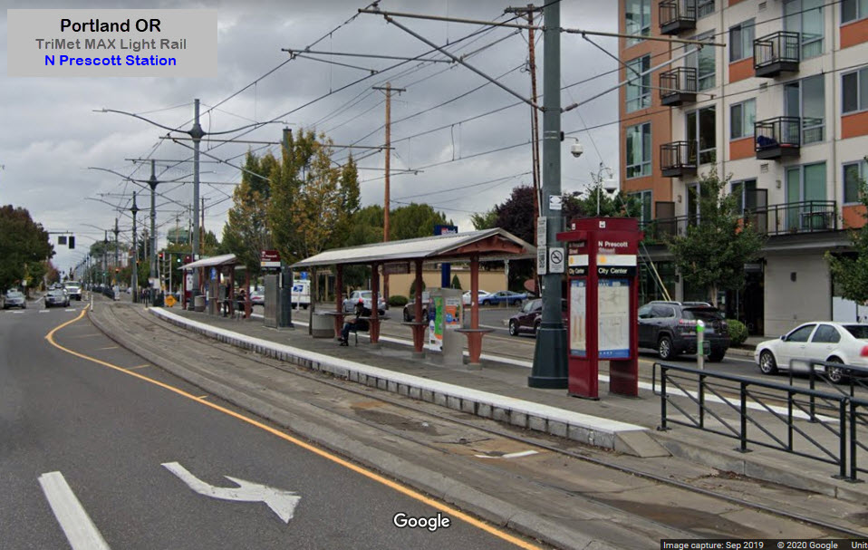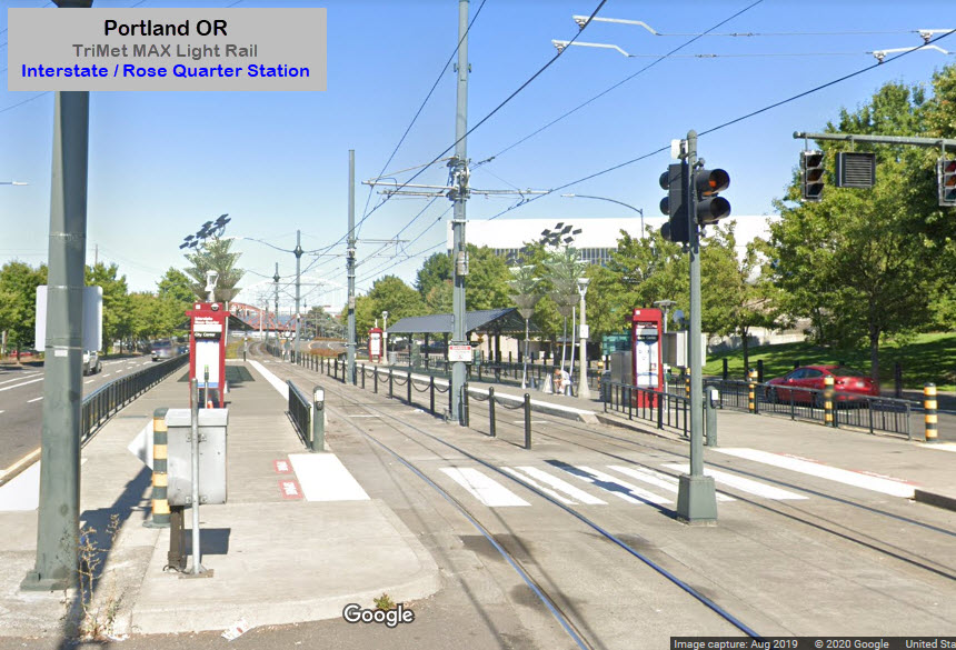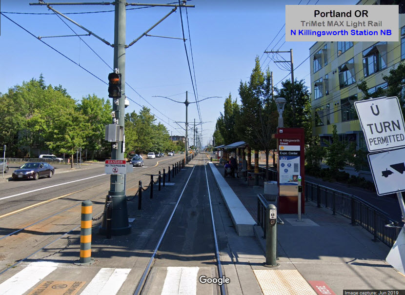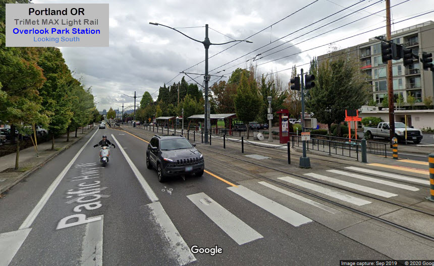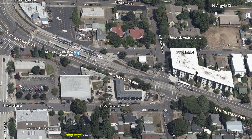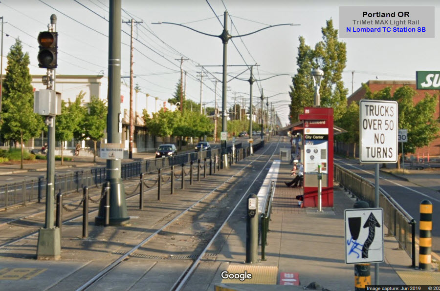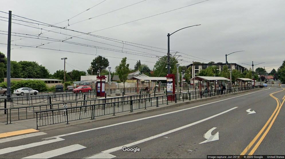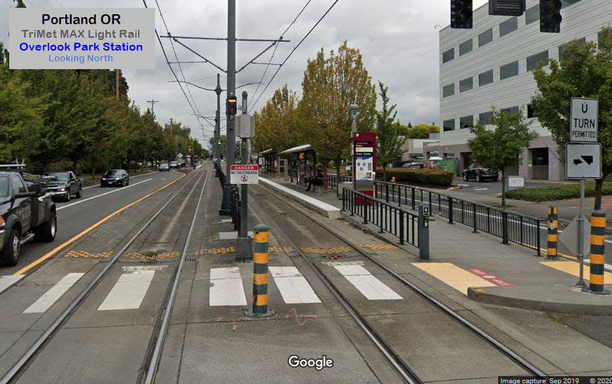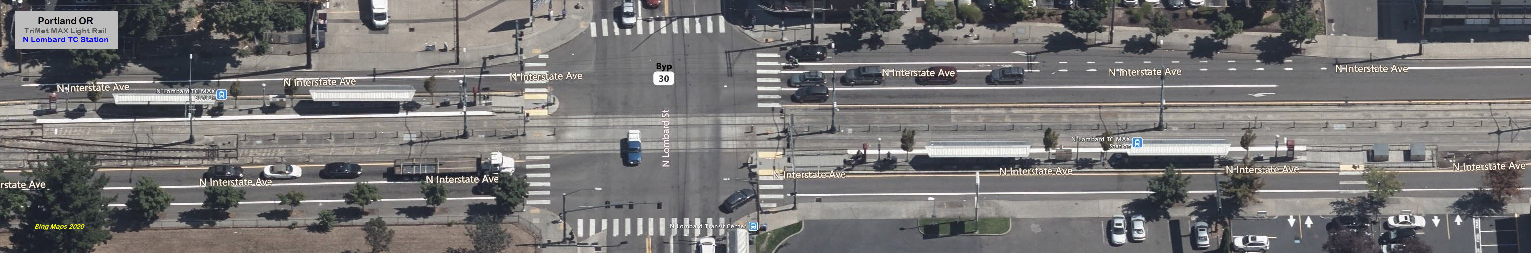 Just to the south of the station, the tracks leave the middle of Interstate Ave,