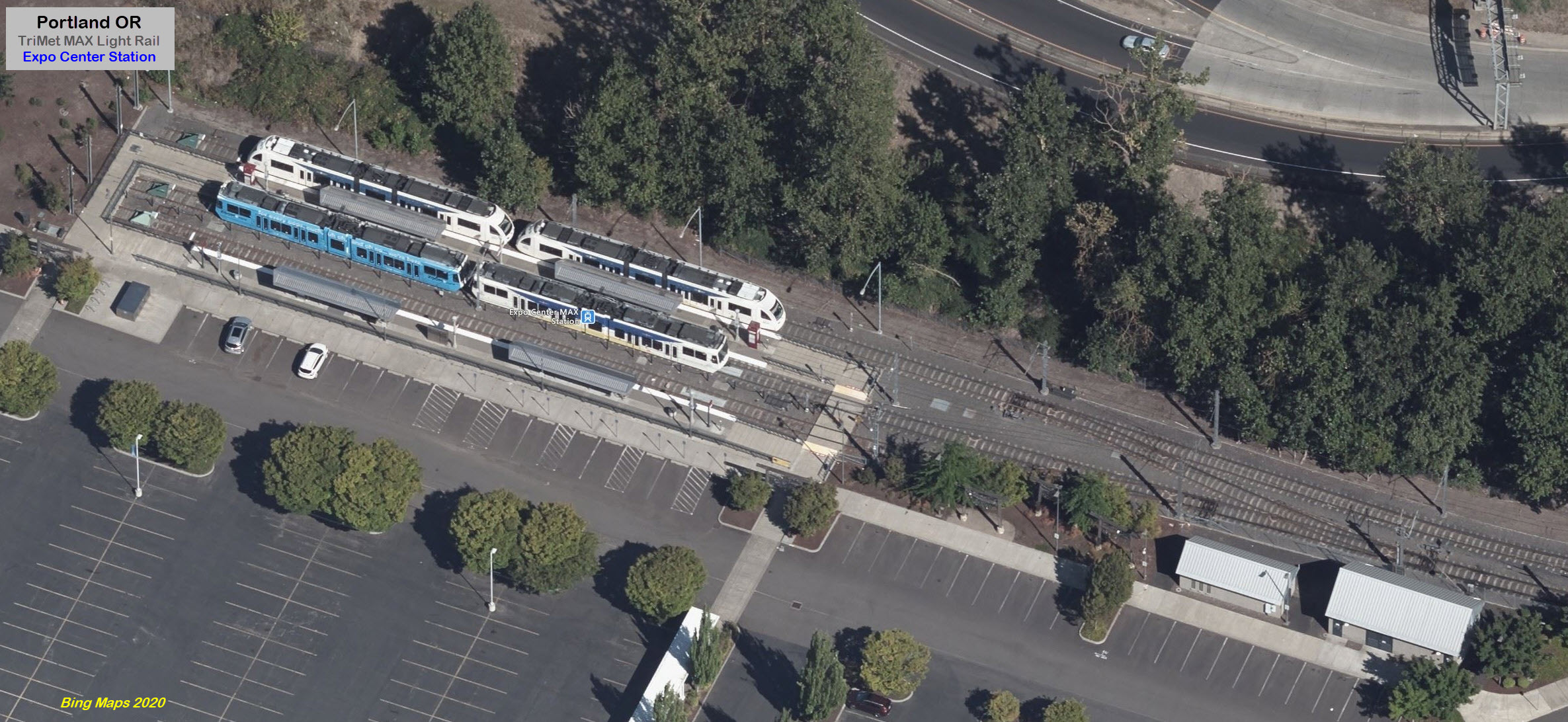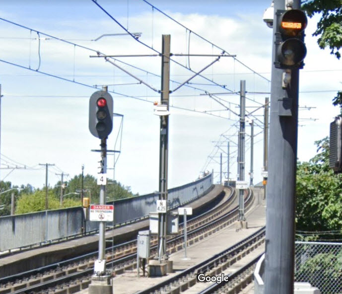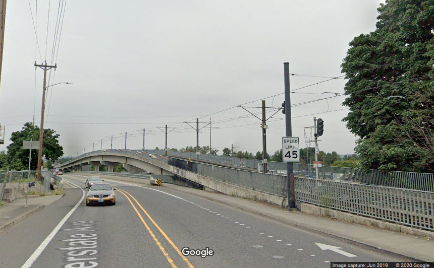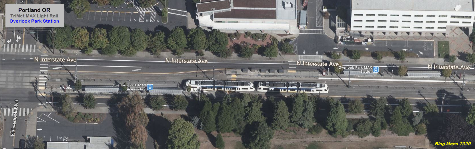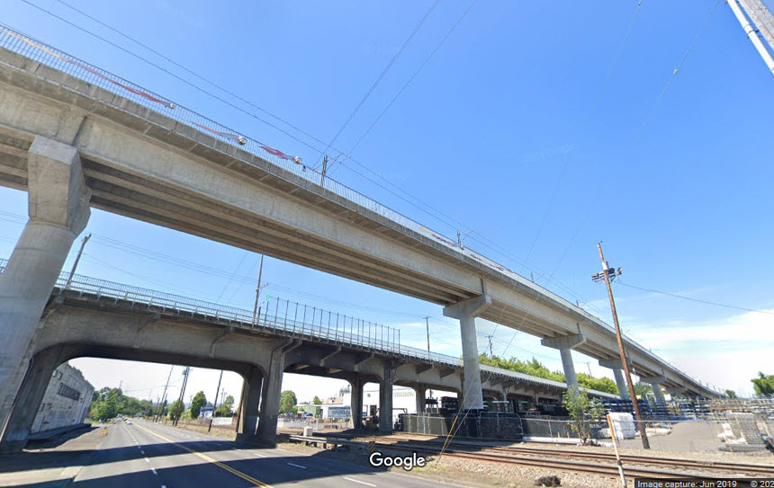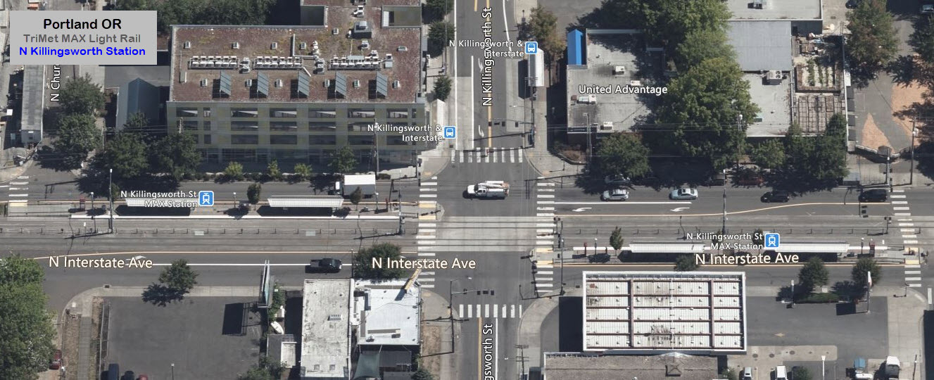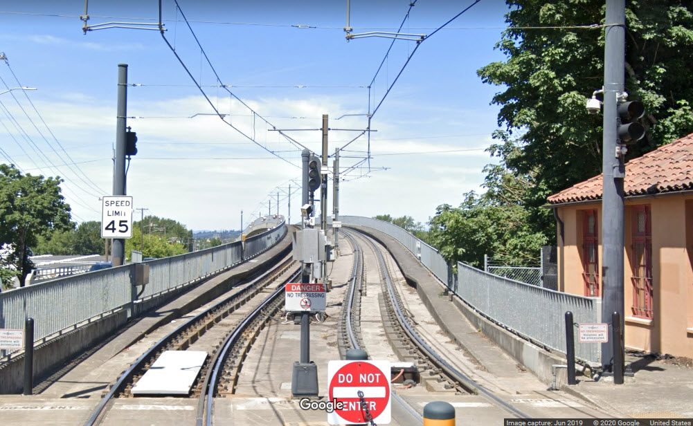 Just south of the station, the elevated section crosses Interstate Ave, and