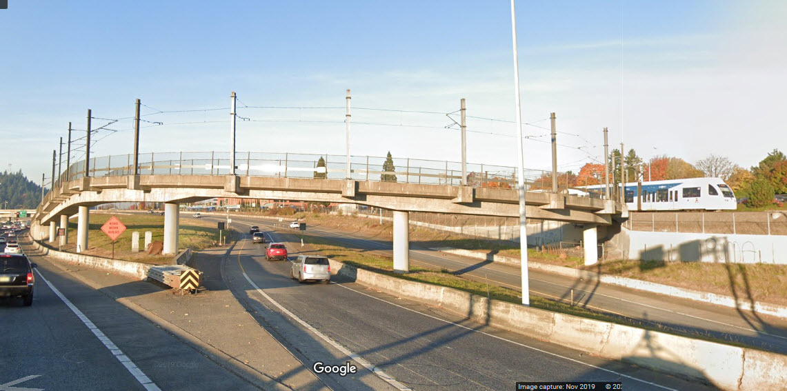 The line is in the middle of I-205 for about a 1.89 mile run (by using Google