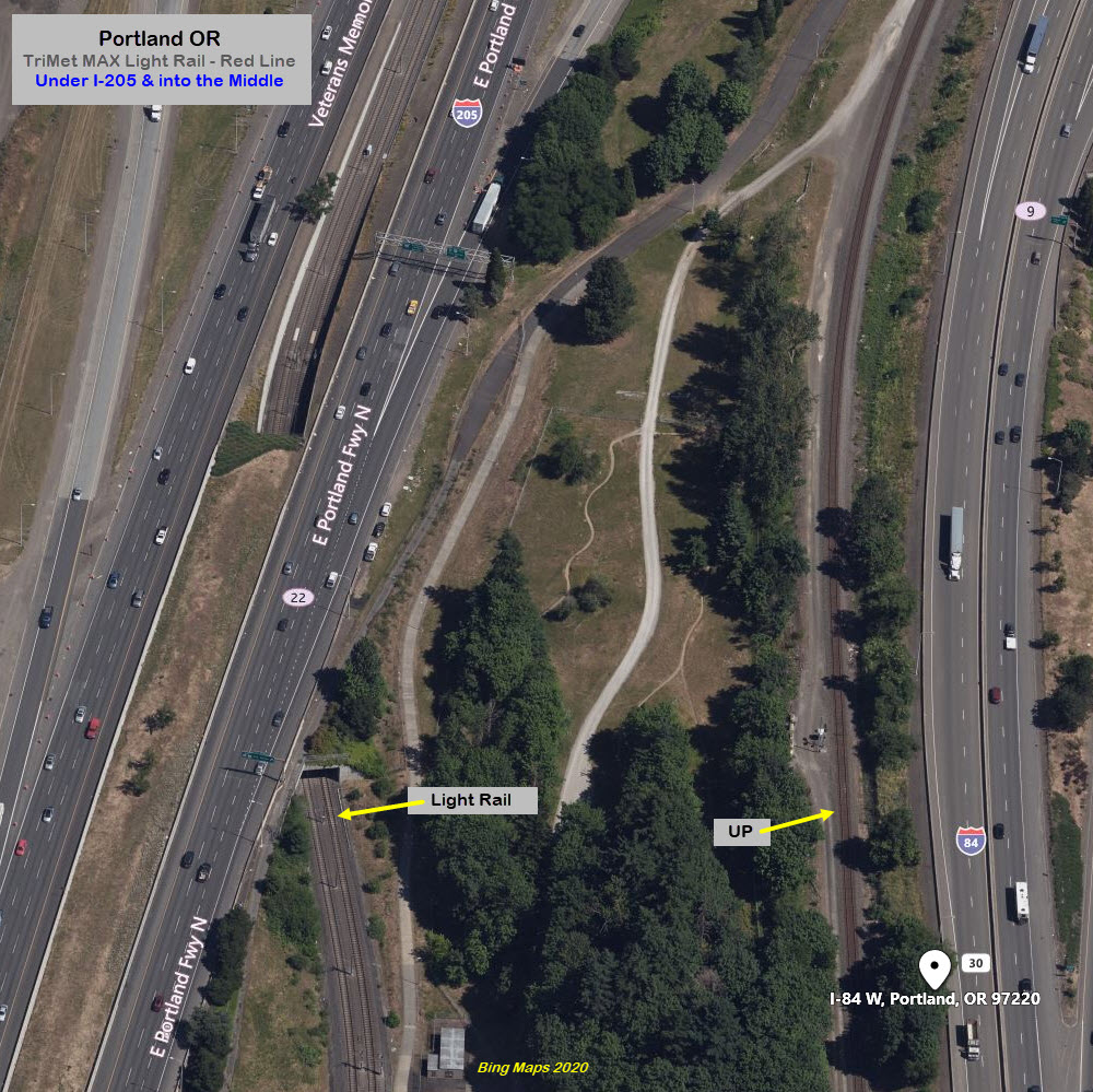 Red Line goes under the northbound side I-205 to run up the middle of the interstate.