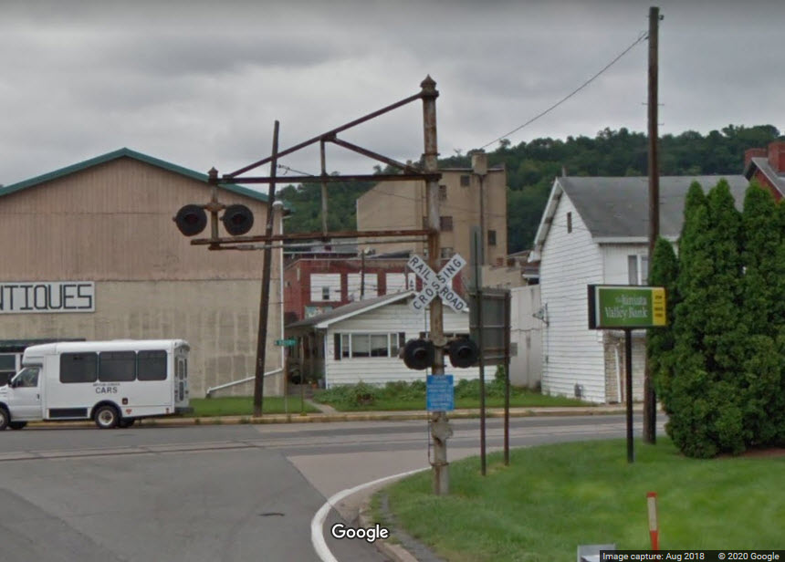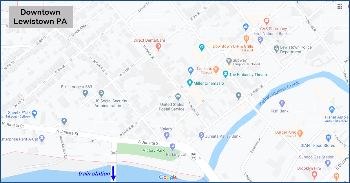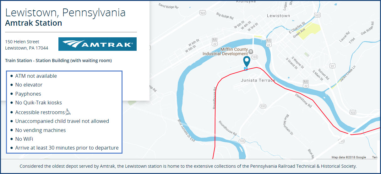 From the Great American Stations page: The Lewistown station sits on the right bank of the Juniata River across from downtown, but the two areas are connected by