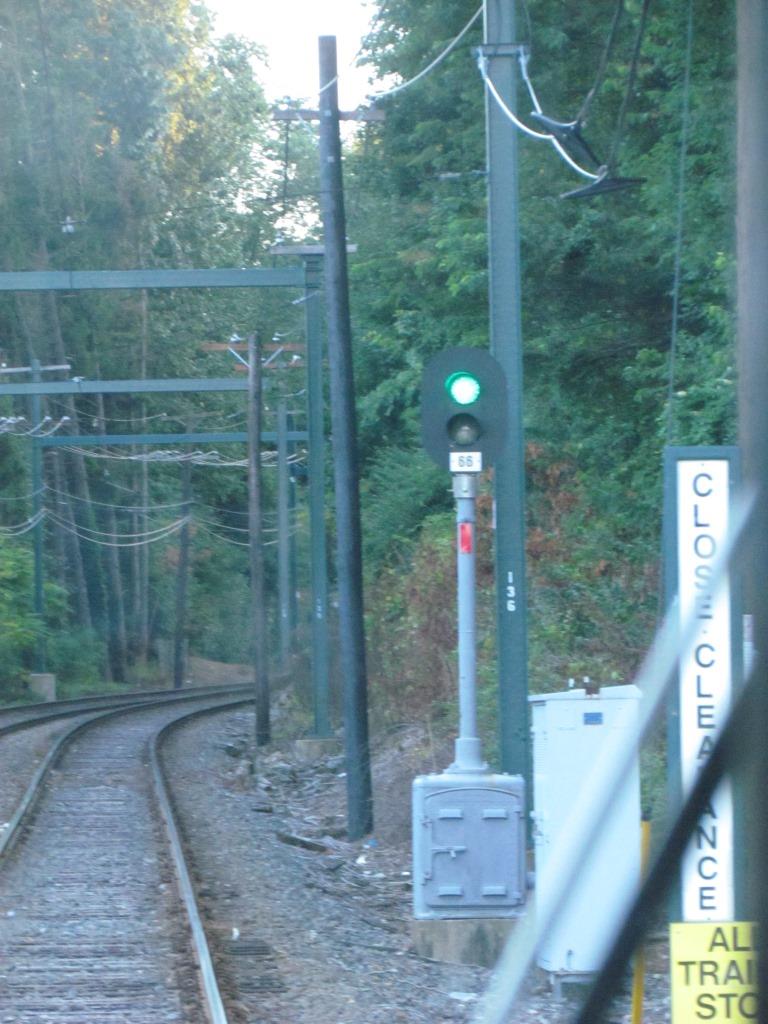 Bar signal and an inbound train around Hilltop Road.