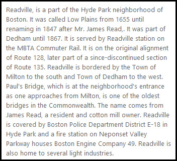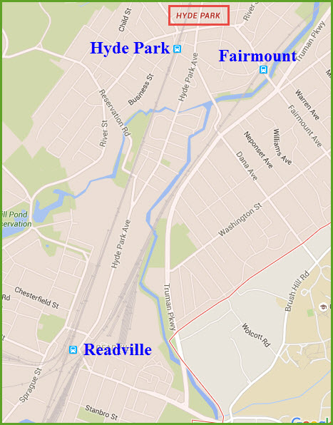 Below left is a current map of Hyde Park, and the three MBTA commuter stations within