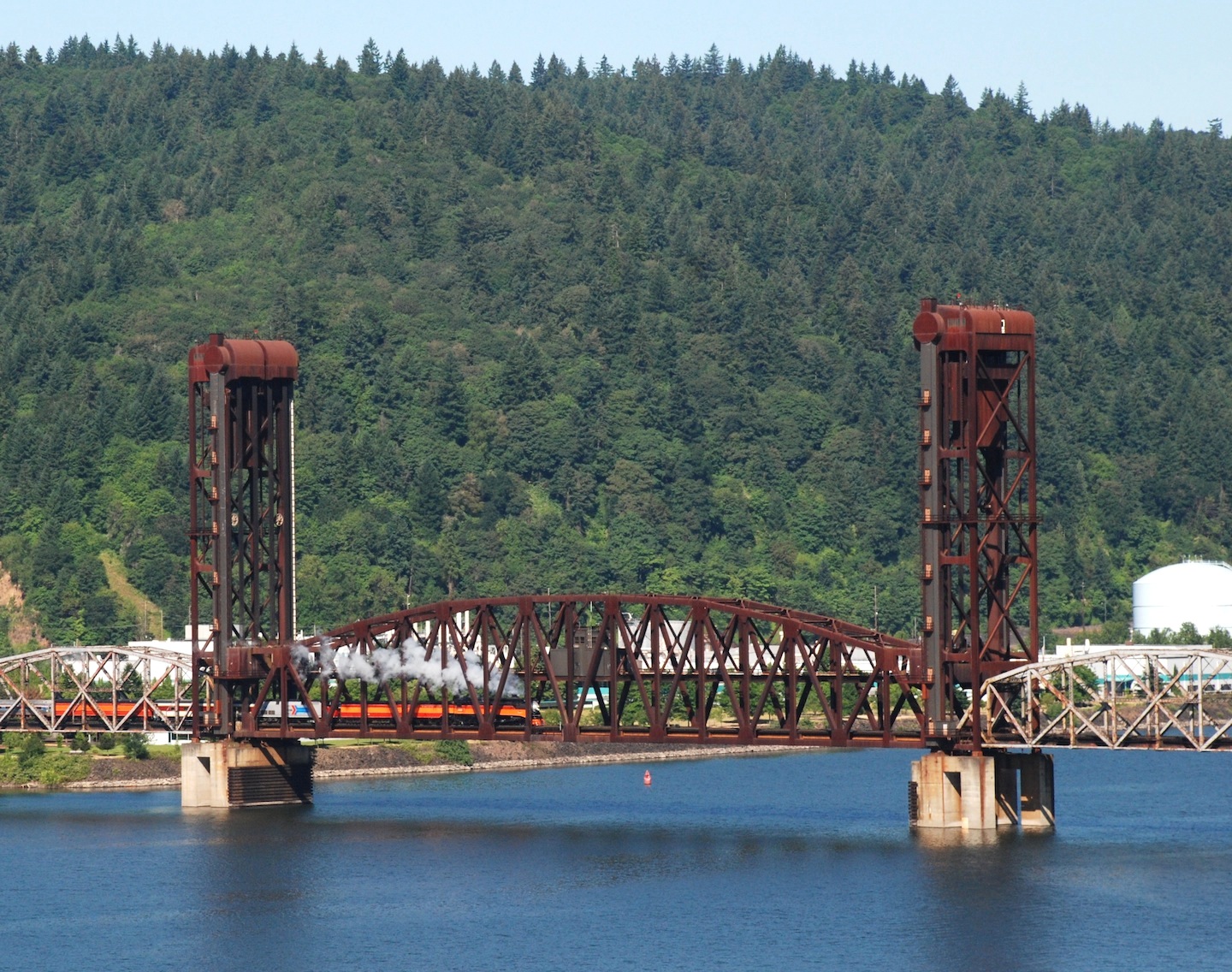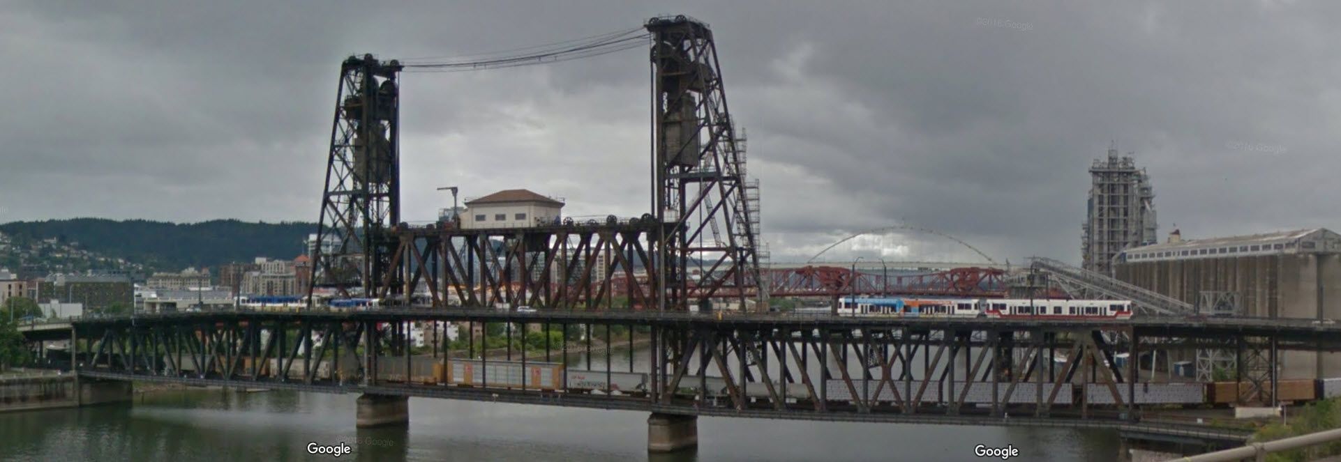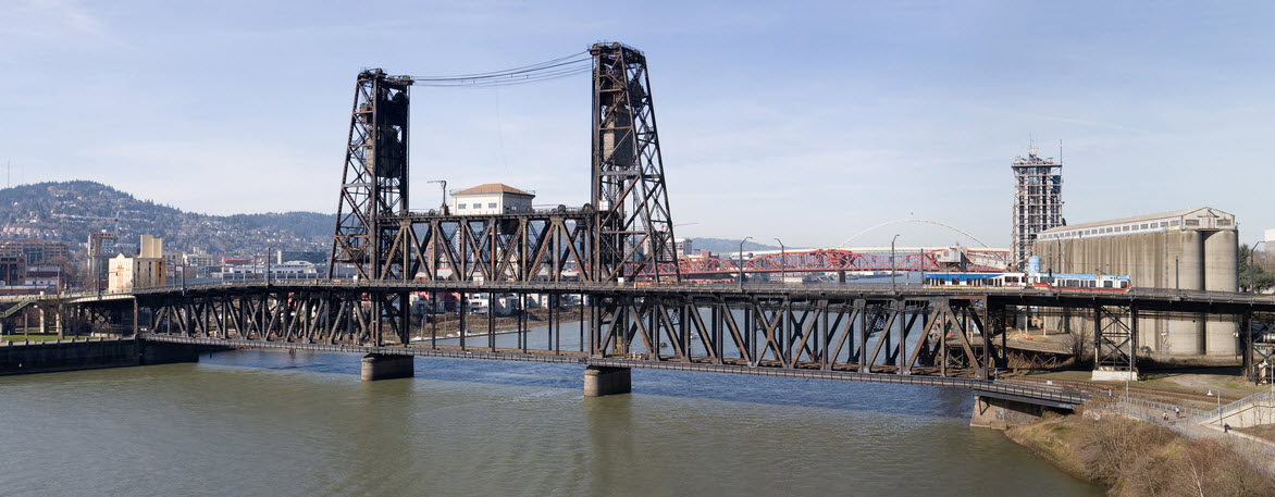The Steel Bridge is a through truss, double-deck vertical-lift bridge across the Willamette River, with railroad traffic on the bottom, and auto/light rail traffic
