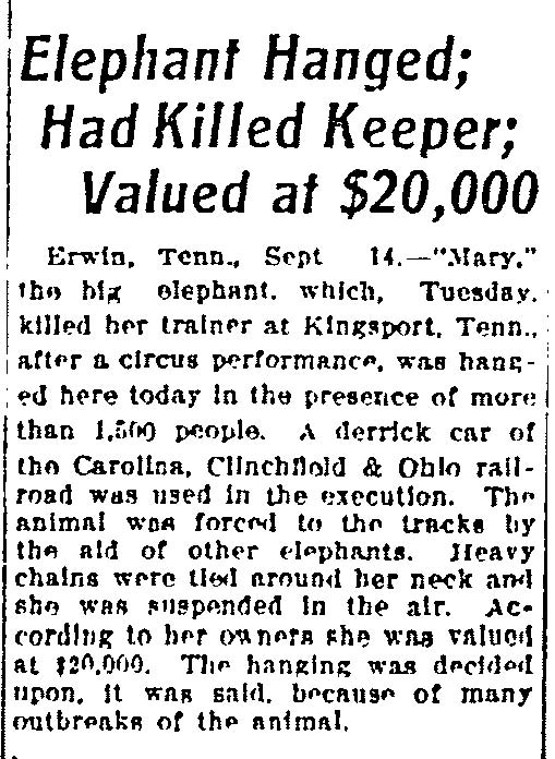 Kingsport TN (about 30 miles north), and during one of the shows, an elephant went berserk and got