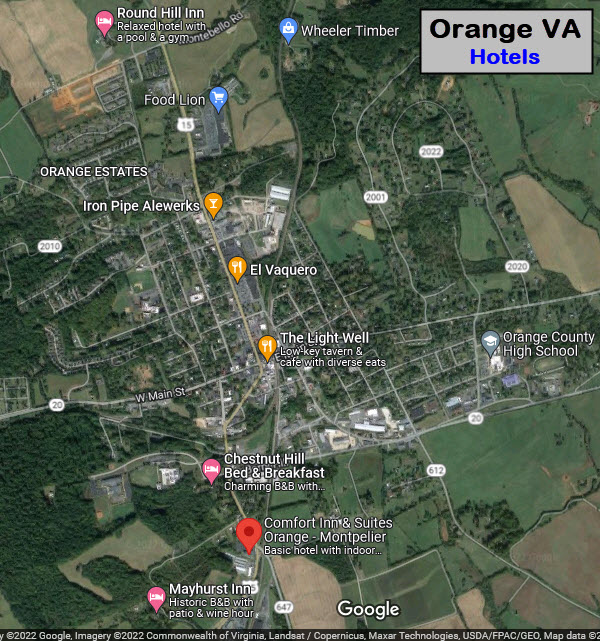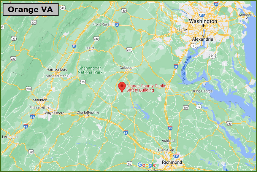 Orange is 25 miles NE of Charlottesville VA, 88 miles SW of Washington DC, about 64 miles