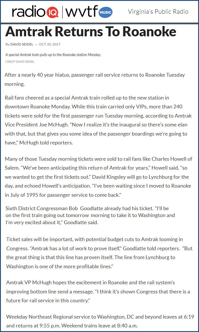 Amtrak started serving Roanoke again on October 31st, 2017, after an almost