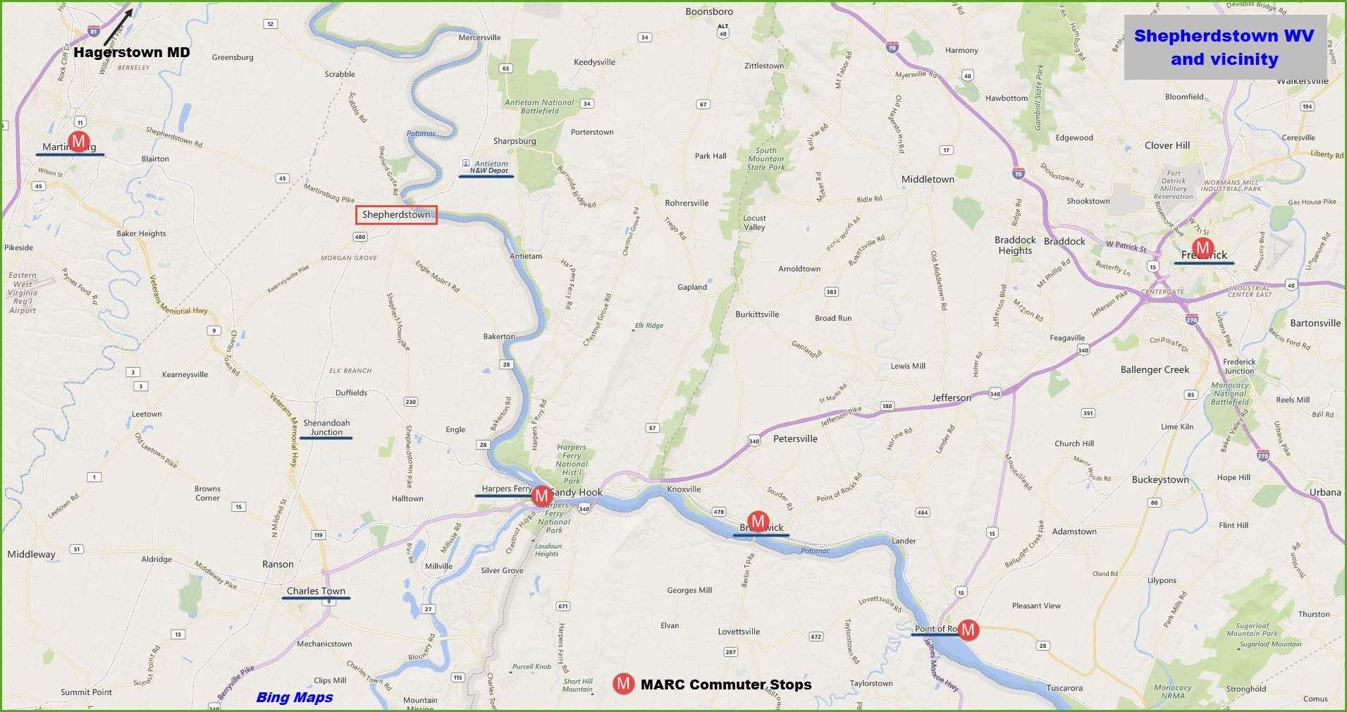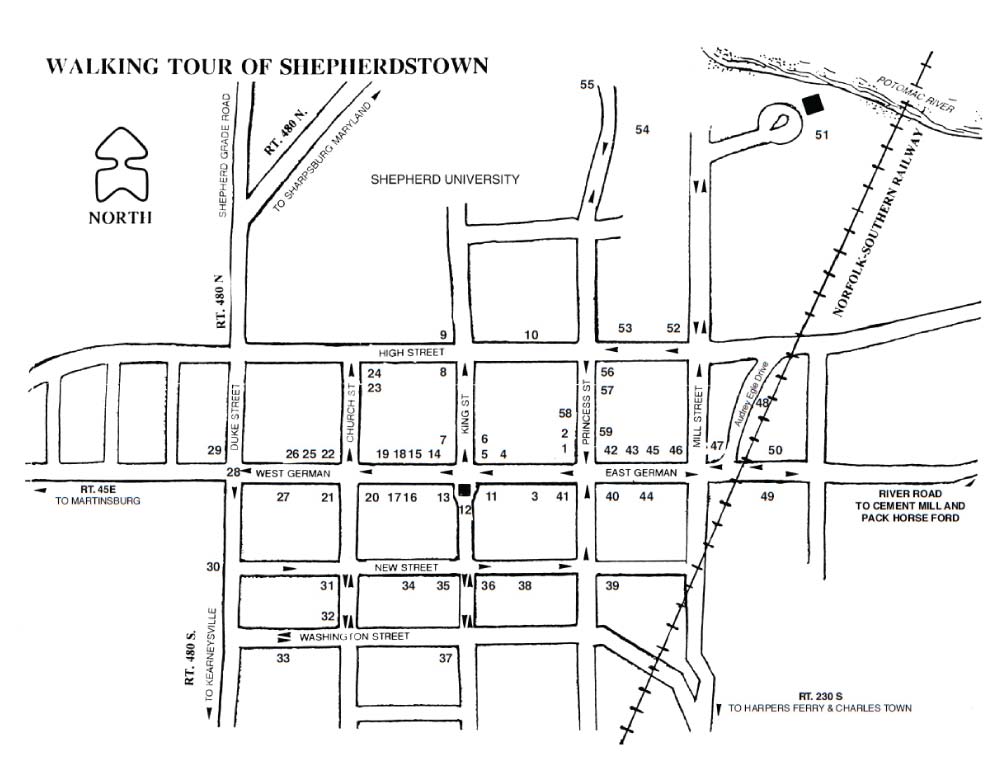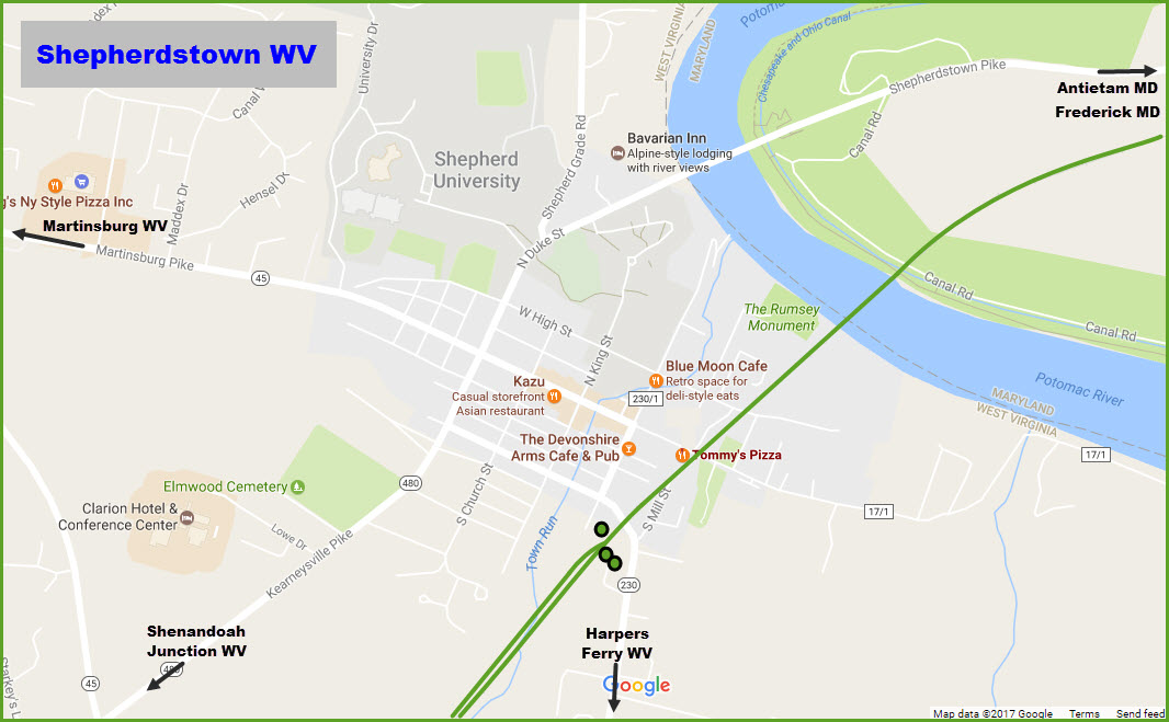 From US11 in Martinsburg, take WV45 8.4mi to Shepherdstown. WV45 is